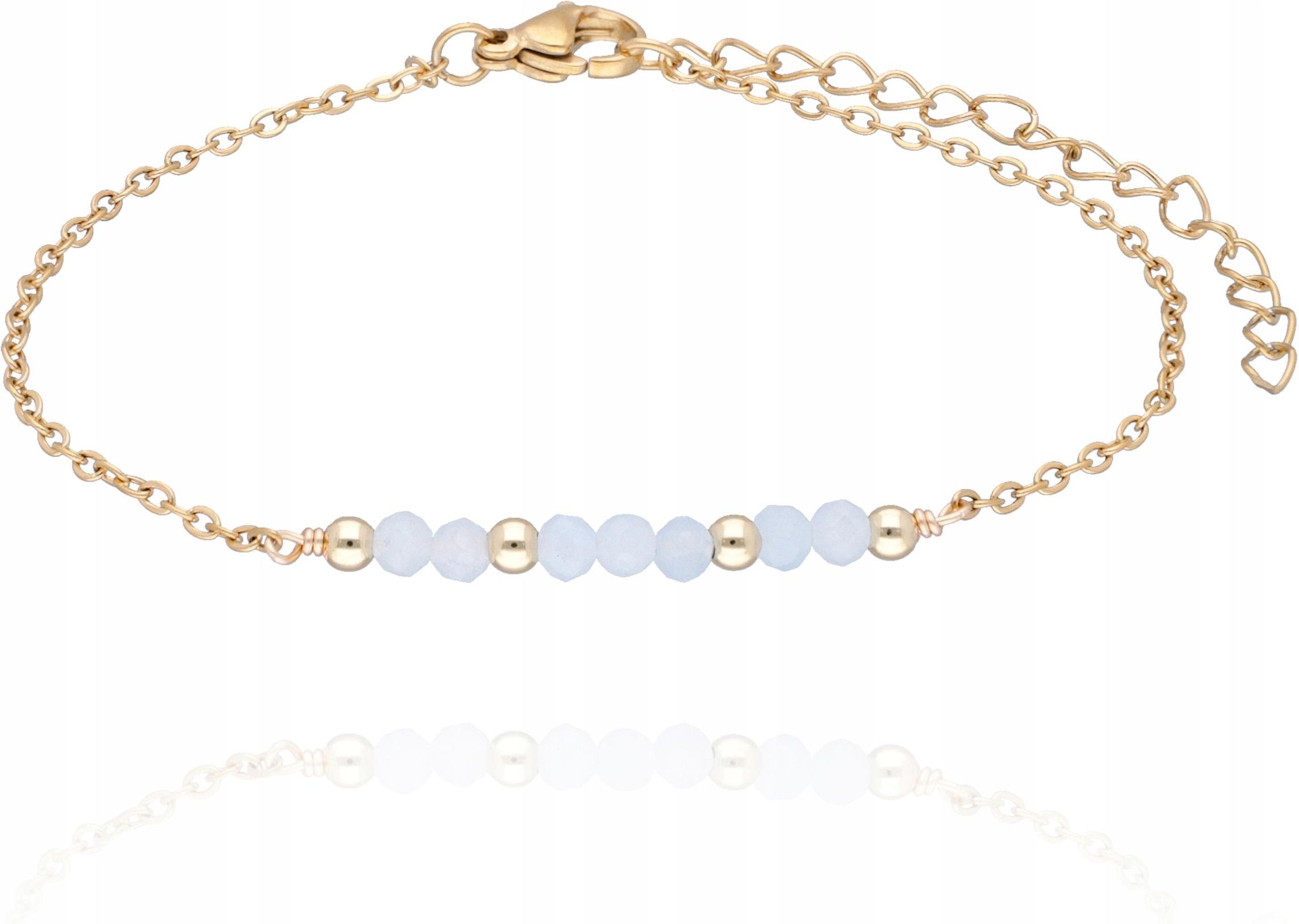 Bransoletka z Kuleczkami i Akwamarynem Delikatna Bransoletka z Kamieniami Naturalnymi Bransoletka z Kamieniem Akwamaryn Specyfikacja Kamień: akwamaryn Długość: około 16,5 cm + 5 cm regulacji Koralik: około 3 mm, fasetowany Ozdobnik: około 3,5 cm, kamienie i kuleczki Kolor: złoty, jasnobłękitny Zapięcie: klasyczne, z regulacją Materiał: kamień, stal szlachetna pozłacana Każda bransoletka jest unikatowa. Zdjęcia przedstawiają przykładowe bransoletki. Bransoletka wysyłana losowo. Opakowanie: ozdobna tekturka biżuteryjna. Bransoletka z Błękitnymi Kamieniami Cechy: Kamienie naturalne: fasetowane akwamaryny. Kolorystyka: odcienie pastelowego błękitu przeplatane złotymi akcentami. Zapięcie: klasyczne zapięcie typu karabińczyk w kolorze złotym. Regulacja długości: przedłużka 5 cm. Styl: subtelny, minimalistyczny, kobiecy. Zalety: Uniwersalna: idealna do różnorodnych stylizacji. Właściwości kamienia: akwamaryn symbolizuje spokój, harmonię, wspiera komunikację. Regulowana długość: komfortowe dopasowanie do każdego nadgarstka. Fasetowane kamienie: pięknie odbijają światło, tworząc efekt subtelnego blasku. Bransoletka z Kamieniem Naturalnym Akwamaryn Spokój i ukojenie: Akwamaryn symbolizuje wodę i morze – ma działać uspokajająco na umysł i emocje. Komunikacja i wyrażanie siebie: Uważa się, że wspiera jasne, szczere wyrażanie myśli i emocji. Pomaga przezwyciężyć nieśmiałość i sprzyja harmonijnej komunikacji. Ochrona energetyczna: Tradycyjnie przypisywano mu właściwości ochronne – zwłaszcza dla podróżników i żeglarzy. Ma chronić przed negatywną energią i niebezpieczeństwami. Czystość duchowa i intuicja: Akwamaryn wspiera rozwój duchowy, wgląd wewnętrzny i intuicję. Pomaga osiągnąć wewnętrzny spokój i zrozumienie siebie.
