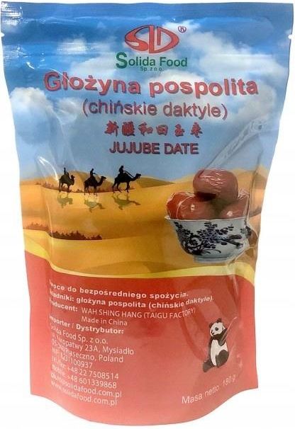 Waga: 180 gData ważności: minimum 24 miesiące Głożyna pospolita, znana również jako chińskie daktyle albo owoce Jujube. Produkt suszony, gotowy do spożycia. Naturalnie słodki, bez dodatku cukru. W kuchni chińskiej owoce te spożywa się w formie przekąski bądź dodawane są do potraw, np. do zup. Często robione są z nich dżemy oraz wina. Mogą być substytutem kawy.
