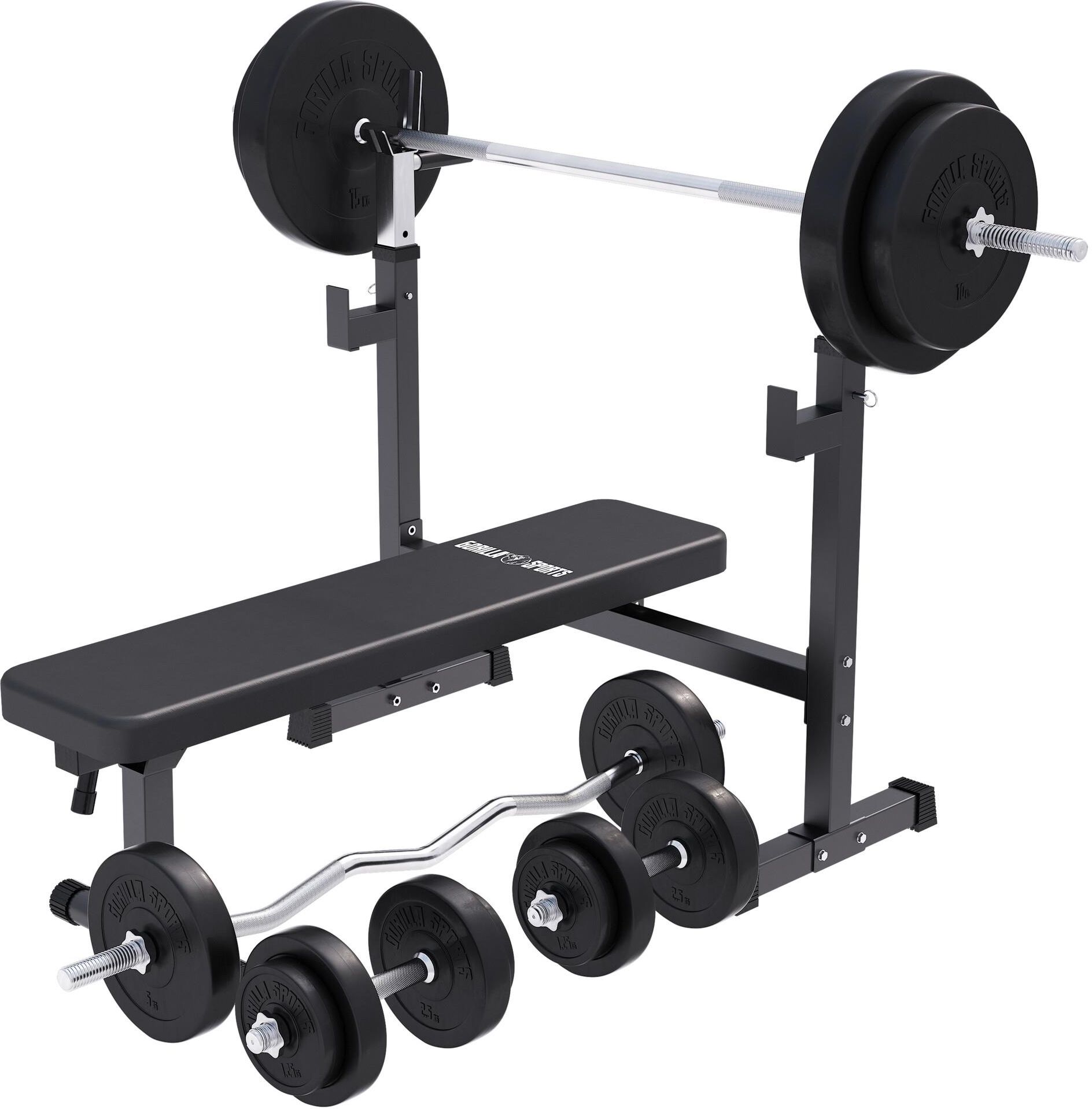 • Zestaw 100 kg - Ławka pod sztangę 3w1 Gorilla Sports obciążenia bitumiczne