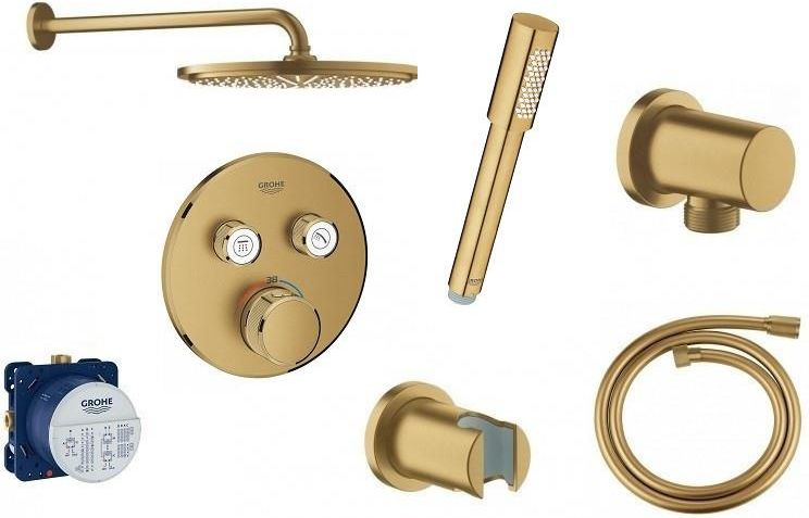 Zestaw 7w1. Grohe kompletny system podtynkowy z deszczownicą w wykończenie złoto szczotkowane - brushed cool sunrise Elementy składowe: 1. Bateria SMARTCONTROL termostatyczna brushed cool sunrise 29119GN0 2. Element podtynkowy GROHE Rapido Smartbox 35600000 3. Deszczownica Rainshower Cosmopolitan …
