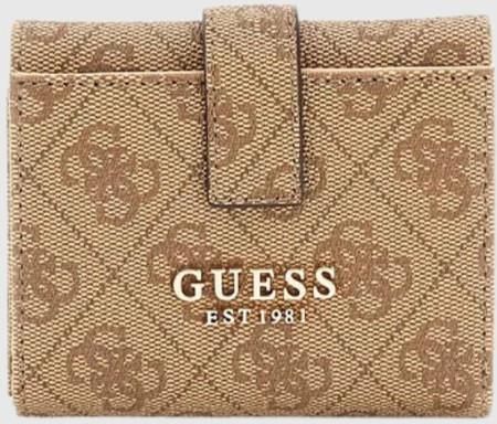 Beżowy damski portfel ze skóry ekologicznej marki Guess. Zamykany na zatrzask, wewnątrz zasuwana kieszeń na bilon, sześć miejsc na karty i wsuwana kieszeń na banknoty.