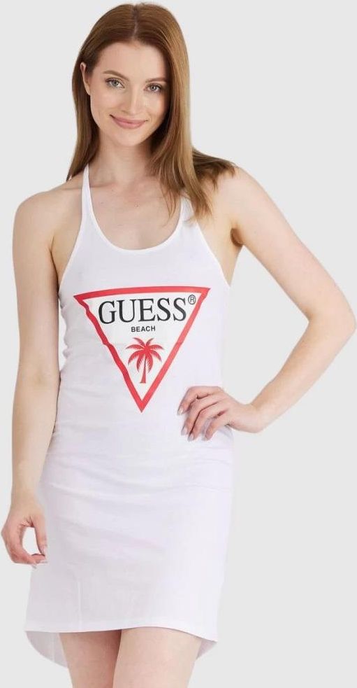 Sukienka Guess w kolorze białym z wyciętymi plecami oraz z nadrukiem z logo. Pranie ręczne w chłodnej wodzie, nie suszyć w suszarce bębnowej, nie stosować wybielaczy. ROZMIAR I DOPASOWANIE: wzrost: 175 cm biust: 90 cm talia: 65 cm biodra: 93 cm Modelka ma na sobie sukienkę w rozmiarze S. Wszystkie produkty z oferty outfit.pl są oryginalne i pochodzą bezpośrednio od producentów lub sprawdzonych dystrybutorów.