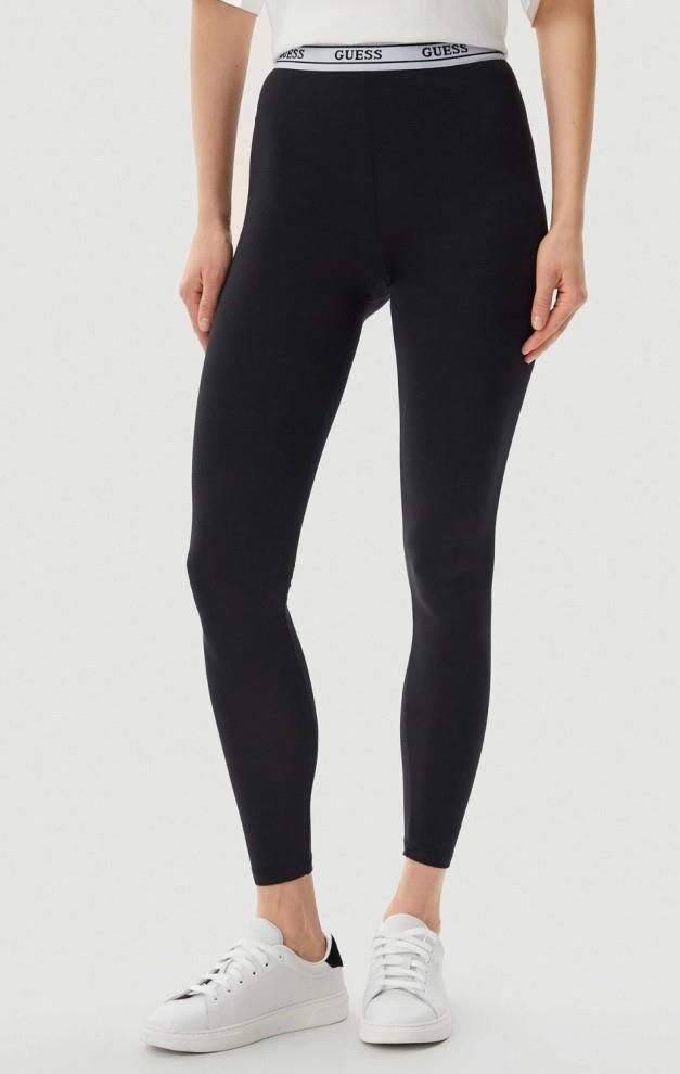 Czarne legginsy damskie Aline marki Guess.Na zdjęciu produkt w rozmiarze: SWymiary produktu w rozmiarze S: szerokość w pasie: 33 cm, długość nogawki od zewnątrz: 93,5 cm, długość nogawki od wewnątrz: 70 cm.