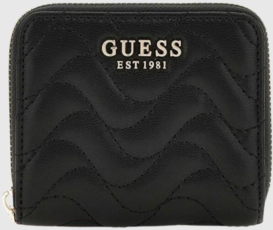 Czarny damski portfel ze skóry ekologicznej marki Guess. Zamykany na zamek, wewnątrz zamykana kieszeń na bilon, jedna przegroda, 4 miejsca na karty.