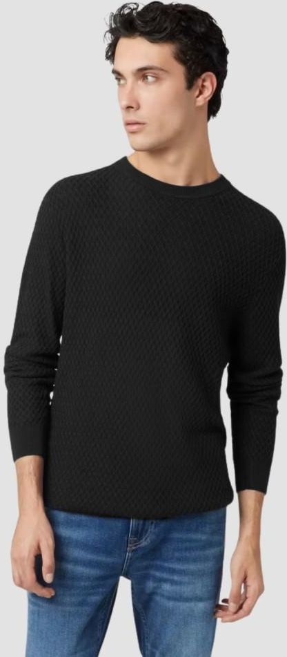 Czarny sweter męski marki Guess wykonany w 60% z bawełny i 40% z modalu, zapewnia wygodę przez cały dzień. Klasyczny fason o regularnym kroju doskonale dopasowuje się do sylwetki, a długie rękawy oraz prosty krój sprawiają, że sweter ma subtelną, ale elegancką formę. Jego minimalistyczny design bez wzorów sprawia, że łatwo dopasuje się do różnych stylizacji.Model ma na sobie produkt w rozmiarze: L.Wymiary produktu w rozmiarze L: szerokość pod pachami: 55,5 cm, długość całkowita: 70,5 cm.