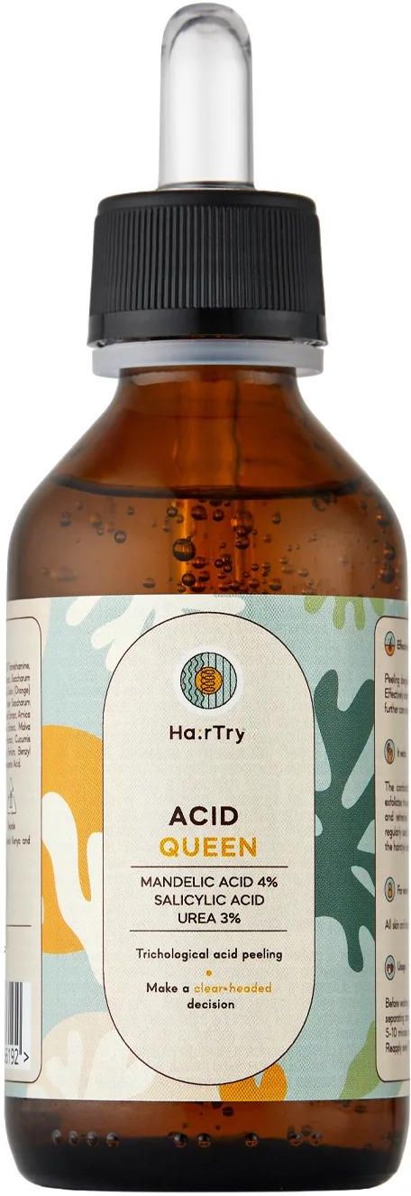 HairTry - Acid Queen - trychologiczny peeling do skóry głowy skutecznie usuwa martwe komórki naskórka, odblokowuje ujścia gruczołów łojowych i działa przeciwbakteryjnie.  Zawarty w kosmetyku 4% kwas migdałowy rozpuszcza nadmiar naskórka, co zapobiega powstawaniu problemów skórnych na głowie. Kwas salicylowy 0,8% ma zdolność rozkładania tłuszczów, więc skutecznie usuwa nadmiar sebum wokół mieszków włosowych. Nawilżający kompleks roślinny to połączenie różnych ekstraktów roślinnych, które łagodzą działanie kwasów i przynoszą skalpowi nawilżenie i ukojenie. Towarzyszy i mocznik 3%, który dodatkowo nawadnia i zmiękcza.