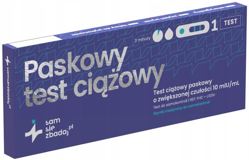 Test ciążowy z moczu paskowy - Samsiezbadaj Samsiezbadaj SamSięZbadaj.pl – Paskowy Test Ciążowy z Moczu – Szybkie Wykrywanie Ciąży Paskowy test ciążowy z moczu to szybki i dokładny sposób na wykrycie ciąży w warunkach domowych. Test działa na zasadzie chromatograficznego testu immunologicznego, który wykrywa obecność ludzkiej gonadotropiny kosmówkowej (hCG) w moczu. Ten hormon jest wskaźnikiem ciąży i jest obecny już w bardzo wczesnych jej stadiach. Co Zawiera Opakowanie Testu Ciążowego? 1x test paskowy 1x instrukcja obsługi Kiedy Wykonać Test Ciążowy z Moczu? Test ciążowy z moczu jest zalecany w przypadku podejrzenia ciąży. Wykonaj test, gdy: Zatrzymanie miesiączki – u kobiet w okresie rozrodczym lub przedmenopauzalnym. Wczesna ciąża i naturalne poronienie – jeśli istnieje potrzeba monitorowania dalszego rozwoju. Możliwość zapłodnienia – w drugiej połowie cyklu miesiączkowego. Badania z promieniowaniem jonizującym lub terapia wpływająca na płód – aby uniknąć potencjalnych zagrożeń. Jak Prawidłowo Wykonać Test Ciążowy? Przed użyciem testu doprowadź go do temperatury pokojowej. Wyjmij pasek testowy z opakowania i użyj go w ciągu godziny. Zanurz pasek w próbce moczu, nie przekraczając linii oznaczonej jako maksimum. Po 15 sekundach wyjmij pasek testowy z moczu lub zostaw go w próbce, uruchamiając stoper. Odczytaj wynik po 3 minutach. Nie interpretuj wyniku po upływie 10 minut. Dokładność Testu Ciążowego Paskowy test ciążowy ma wysoką dokładność wynoszącą 99%, co pozwala na szybkie i pewne wykrycie ciąży. Przeciwwskazania i Środki Ostrożności Przed użyciem zapoznaj się z treścią ulotki dołączonej do opakowania. W przypadku pozytywnego wyniku testu skonsultuj się z lekarzem. Przechowuj test w miejscu niedostępnym dla dzieci. Przed użyciem wyrobu należy zapoznać się z treścią ulotki dołączonej do opakowania. w zestawie instrukcja w języku polskim Numer jednostki notyfikującej 0123 Produkt zawiera deklarację zgodności UE Certyfikat CE widoczny jest na zdjęciach Etykieta, oznakowanie, instrukcja obsługi oraz interfejs użytkownika są w języku polskim Testy są do samokontroli/samodzielnego wykonania w warunkach domowych. Test nie zawiera substancji niedozwolonych Oferowany produkt jest wyrobem medycznym jednorazowego użytku oznaczonym znakiem CE. Używaj go zgodnie z instrukcją używania lub etykietą SamSięZbadaj.pl Paskowy test ciążowy (mocz) to szybki chromatograficzny test immunologiczny do jakościowego wykrywania ludzkiej gonadotropiny kosmówkowej (hCG) w moczu pacjenta w celu wczesnego wykrycia ciąży.