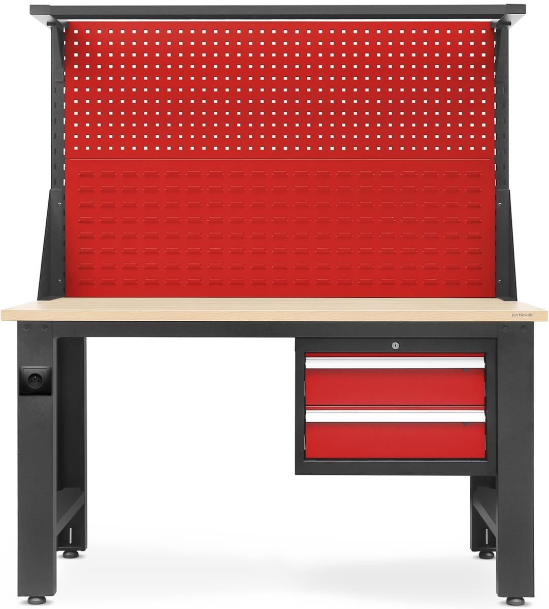 Marka Jan Nowak specjalizuje się w projektowaniu funkcjonalnych i nowoczesnych szaf metalowych, które już od 18 lat pomagają naszym klientom efektywnie organizować przestrzeń w ich biurach, szatniach, warsztatach a nawet domach. Wyznaczamy trendy, a naszemu opatentowanemu wzornictwu i najwyższej jakości zaufały już miliony klientów w aż 40 krajach całego świata. Kolekcja JAN NOWAK Meble biurowe JAN NOWAK gwarantują swoim użytkownikom najwyższe standardy jakości. Jesteśmy jednym z największych dostawców szaf metalowych w Europie. Jan Nowak stół do warsztatu LOGAN, antracytowo-czerwony Profesjonalne biurko warsztatowe LOGAN spełni Twoje marzenia o praktycznym i wygodnym pomieszczeniu do pracy czy majsterkowania. Zaprojektowaliśmy je tak, by spełniało wszystkie Twoje potrzeby. Biurko warsztatowe LOGAN ma obszerny blat, wytrzymałą konstrukcję, tablicę perforowaną, szuflady zamykane na klucz oraz miejsce do zamontowania lampy. Solidna baza dla Twojego warsztatu Stół do pracy to centrum dowodzenia w każdym warsztacie, dlatego powinien on być niezawodny i trwały. Biurko warsztatowe LOGAN łączy w sobie mocną stal i blat z laminowanej płyty MDF o grubości 3 cm. Nasze rozwiązanie zapewni Ci imponującą powierzchnię roboczą o wymiarach 150 x 75 cm, a także wyjątkowo duży udźwig wynoszący 600 kg. Jest to zasługa bardzo masywnego stelażu, który powstaje z profili stalowych o grubości 1,5 mm. Cała konstrukcja posiada zabezpieczenie antykorozyjne. Dedykowana nadbudowa stołu Biurko warsztatowe z dedykowaną nadbudową to świetna opcja. Po pierwsze, dlatego że zyskujesz pewność, że rozwiązanie będzie idealnie dopasowane do blatu i wyjątkowo stabilne. Po drugie oszczędzasz czas, gdyż wszystko zamawiasz za jednym zamachem. Dzięki temu nie musisz poświęcać ani chwili na szukanie odpowiedniego modelu. Nadbudowa biurka warsztatowego LOGAN jest niezwykle funkcjonalna. Posiada tablicę narzędziową, którą podzieliliśmy na dwie części. Dolna pozwoli Ci przechowywać drobne elementy w pojemnikach magazynowych ergobox, natomiast górna służy do organizacji narzędzi, takich jak śrubokręty, klucze, młotki, miarki, poziomnice. Do zamocowania akcesoriów nie potrzebujesz śrub i w każdym momencie możesz zmienić ich ułożenie. Uchwyty oraz haki należy zakupić samodzielnie. Szuflady zamykane na klucz Dla sprzętów, których nie będziesz w stanie powiesić na tablicy perforowanej, przygotowaliśmy szuflady. Mocne prowadnice zapewniają płynną pracę i udźwig do 45 kg. Szuflady są zamykane na klucz, dlatego świetnie nadają się również do magazynowania dokumentów. Schowane przedmioty z pewnością nie dostaną się w niepowołane ręce. Jeden zamek zabezpiecza dwie szuflady, zestaw zawiera dwa klucze. Biurko warsztatowe, które zachwyca detalami Malowanie proszkowe - stalowe elementy pokryte są lakierem proszkowym, który chroni przed rdzą oraz zwiększa estetykę rozwiązania. Nóżki poziomujące - z biurkiem warsztatowym LOGAN żadne nierówności nie będą Ci straszne. Satysfakcjonująca powierzchnia do pracy - blat aż 75 cm głębokości nawet przy zawieszonych ergoboxach, wciąż zaoferuje Ci wystarczająco dużo przestrzeni roboczej. Regulowany stelaż na lampę - górna belka umożliwi Ci montaż oświetlenia, które zwiększy Twój komfort (brak w lampy zestawie). Wygodne uchwyty do szuflad - niezależnie czy masz na sobie rękawice, czy skupiasz się na realizowanym zadaniu, otwarcie szuflady jest wyjątkowe proste. Kształt biurka warsztatowego pozwoli Ci na wykonywanie swoich obowiązków w pozycji siedzącej. Wielogodzinna praca stanie się o wiele przyjemniejsza. Biurko warsztatowe LOGAN — specyfikacja Kolor: antracytowo-czerwony RAL 7016 - RAL 3020 Wysokość blatu: 80 cm Szerokość blatu: 150 cm Głębokość blatu: 75 cm Grubość blatu: 3 cm Wysokość z nadbudową: 170 cm Waga: 86 kg Materiał blatu: laminowana płyta MDF Konstrukcja stołu: stal malowana proszkowo grubość 1,5/1,0/0,8 mm Maksymalne obciążenie do 600 kg Dopuszczalne obciążenie szuflady: 45 kg Gwint regulowanych nóżek: 9 mm Tablica perforowana: odległość między otworami 27 mm wymiary otworów 10 mm x 10 mm WAŻNE Produkt wysyłany jest w częściach, do samodzielnego montażu. W zestawie znajduje się czytelna instrukcja.