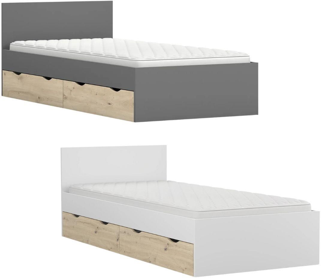 Łóżko Joy to stylowe i funkcjonalne rozwiązanie do pokoju młodzieżowego lub dziecięcego.Dostępne w dwóch atrakcyjnych wersjach kolorystycznych – biały + dąb artisan oraz szary + dąb artisan – wpisuje się w nowoczesne i ponadczasowe wnętrza.Model o powierzchni spania 90x200 cm wyposażony jest w dwie głębokie szuflady, które umożliwiają praktyczne przechowywanie pościeli, ubrań sezonowych czy zabawek.Solidna konstrukcja z laminowanej płyty 16 mm, system bezuchwytowy oraz estetyczne wykończenia obrzeżem ABS zapewniają trwałość i estetykę przez lata.Łóżko jest częścią kolekcji Joy.Duże szuflady gwarantują łatwy dostęp i komfort codziennego użytkowania.Nowoczesny design sprawia, że łóżko Joy doskonale uzupełni każdą aranżację pokoju młodzieżowego.Bezpieczeństwo i trwałość – wykonanie z wysokiej jakości materiałów i stabilna konstrukcja.Łóżko nie zawiera materaca!Model objęty jest 2 letnią gwarancją producenta.Produkt dostarczymy do Państwa BEZPŁATNIE pod wskazany adres na terenie całego kraju.Mebel wymaga samodzielnego montażu, zgodnie z załączoną instrukcją.Co WAŻNE: zgodnie z prawem i naszymregulaminemmają Państwo pełne prawo do zwrotu nieużywanych towarów, jeśli nie spełnią one Państwa oczekiwań. Wymiary: