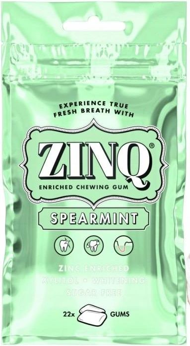 ZINQ SPEARMINT guma do żucia to nowoczesna guma do żucia, stworzona z myślą o kompleksowym wsparciu zdrowia jamy ustnej. Jej wyjątkowa formuła łączy intensywnie odświeżający smak zielonej mięty z działaniem składników aktywnych, takich jak octan cynku (0,1\%) – znany z naturalnych właściwości antybakteryjnych. Dodatek ksylitolu pomaga chronić zęby przed rozwojem próchnicy, a mikrogranulki zawarte w gumie wspierają redukcję płytki nazębnej, zapewniając jeszcze skuteczniejszą pielęgnację. Produkt został rekomendowany przez Szwedzkie Towarzystwo Stomatologiczne, co potwierdza jego wysoką jakość, bezpieczeństwo i efektywność w codziennym stosowaniu. Guma ZINQ® Spearmint nie zawiera cukru, dzięki czemu jest bezpieczna dla szkliwa i może być stosowana zawsze, gdy potrzebujesz długotrwałej świeżości oddechu i wsparcia dla zdrowych zębów.SkładSłodziki (ksylitol, sorbitol, mannitol, maltitol, syrop, aspartam, acesulfam K), gumowa baza, wypełniacz (węglan potasu 3,0\%), aromaty, stabilizator (guma arabska), barwnik (dwutlenek tytanu), substancja utrzymująca wilgoć (glicerol), regulator kwasowości (wodorowęglan sodu 0,27\%), minerał (octan cynku 0,1\%), emulgator (lecytyna słonecznikowa), środek glazurujący (wosk Carnauba).Wartości odżywcze na 100g:Energia: 613 kJ / 147 kcalTłuszcz: 0 gWęglowodany: 62 gCukry: 0 gBiałko: 0 gSól: 0,2 gCynk: 29,78 mgCechy produktu- Zaawansowana formuła dla zdrowej jamy ustnej – Skład opracowany tak, by nie tylko odświeżał oddech, ale realnie wspierał higienę i kondycję jamy ustnej.- Wegański skład – Odpowiednia dla osób wykluczających składniki pochodzenia zwierzęcego.- Skutecznie likwiduje nieświeży oddech – Działa u źródła problemu, eliminując przyczyny nieprzyjemnego zapachu zamiast jedynie je ukrywać.- Wzbogacona cynkiem – Pierwiastek znany z właściwości antybakteryjnych i pozytywnego wpływu na zdrowie jamy ustnej.- Długotrwały efekt świeżości – Smak utrzymuje się wyraźnie dłużej niż w tradycyjnych gumach, gwarantując uczucie czystości na dłużej.- Bez cukru – Przyjazna dla zębów, nie zwiększa ryzyka próchnicy wynikającej ze spożycia cukru.Przeciwwskazania Nie stosować w przypadku nadwrażliwości na którykolwiek ze składników.Uwagi Preparat należy przechowywać w sposób niedostępny dla małych dzieci.