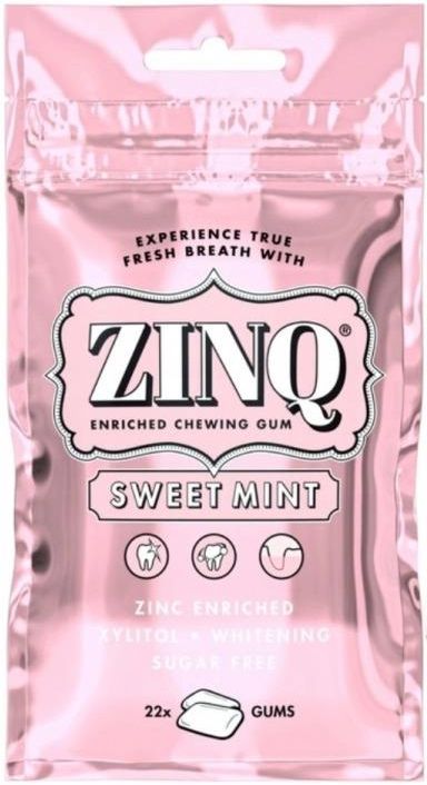 ZINQ SWEET MINT guma do żucia to nowoczesna guma do żucia stworzona z myślą o kompleksowym wsparciu zdrowia jamy ustnej. Jej unikalna formuła łączy przyjemny smak słodkiej mięty z działaniem składników aktywnych, takich jak octan cynku (0,1\%) – ceniony za naturalne właściwości antybakteryjne. Dodatek ksylitolu wspomaga ochronę przed próchnicą, a specjalne mikrogranulki przeciwdziałają powstawaniu płytki nazębnej, zapewniając skuteczniejsze dbanie o zęby. Guma jest rekomendowana przez Szwedzkie Towarzystwo Stomatologiczne, co potwierdza jej wysoką jakość i efektywność w codziennym stosowaniu. ZINQ® Sweet Mint nie zawiera cukru, dzięki czemu jest bezpieczna dla szkliwa i może być stosowana zawsze, gdy potrzebujesz świeżego oddechu oraz wsparcia dla zdrowych zębów.SkładSłodziki (ksylitol, sorbitol, mannitol, syrop maltitolowy, acesulfam K), gumowa baza, wypełniacz (węglan potasu 3,0\%), aromaty, stabilizator (guma arabska), barwnik (dwutlenek tytanu), substancja utrzymująca wilgoć (glicerol), regulator kwasowości (wodorowęglan sodu 0,27\%), minerał (octan cynku 0,1\%), emulgator (lecytyna słonecznikowa), środek glazurujący (wosk Carnauba).Wartości odżywcze na 100g:Energia: 633 kJ / 152 kcalTłuszcz: 0 gWęglowodany: 64 gCukry: 0 gBiałko: 0 gSól: 0,2 gCynk: 29,78 mgCechy produktu- Nowoczesna formuła dla zdrowej jamy ustnej – Skład gumy nie tylko odświeża oddech, lecz także wspiera codzienną higienę i kondycję jamy ustnej.- W 100\% wegańska – Idealna dla osób wybierających produkty bez składników pochodzenia zwierzęcego.- Skuteczna w walce z nieświeżym oddechem – Działa u źródła problemu, eliminując przyczyny nieprzyjemnego zapachu, zamiast je maskować.- Wzbogacona cynkiem – Naturalne właściwości antybakteryjne cynku wspierają zdrowie jamy ustnej.- Długotrwała świeżość – Smak utrzymuje się znacznie dłużej niż w tradycyjnych gumach, zapewniając uczucie czystości i świeżości.- Bez cukru – Bezpieczna dla zębów i szkliwa, nie zwiększa ryzyka próchnicy.Przeciwwskazania Nie stosować w przypadku nadwrażliwości na którykolwiek ze składników.Uwagi Preparat należy przechowywać w sposób niedostępny dla małych dzieci.