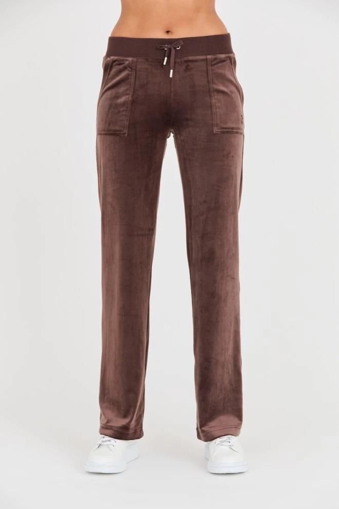 Brązowe damskie spodnie Del Ray Pocket Pant, marki JUICY COUTURE. Wymiary modelki: wzrost 176 cm, biust 85 cm, talia 65 cm, biodra 92 cm. Modelka ma na sobie produkt w rozmiarze S.