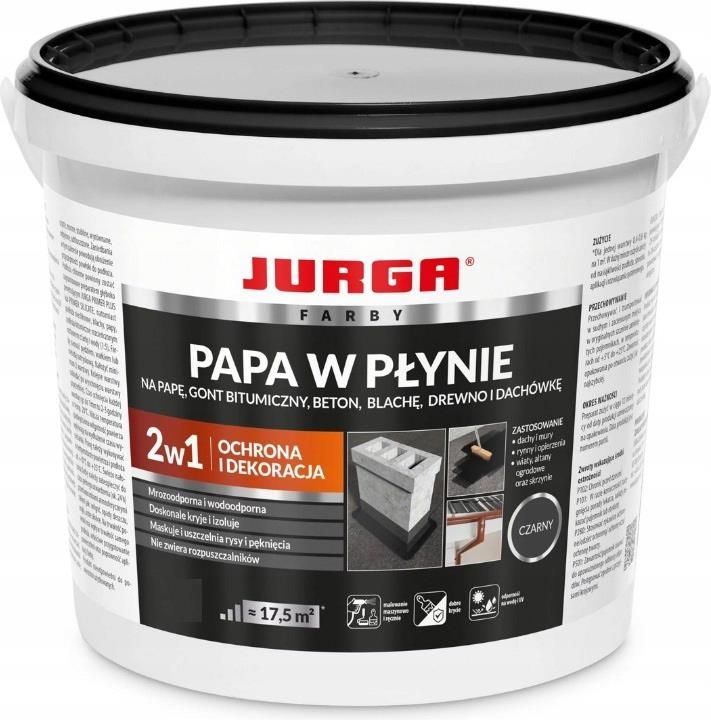 JURGA Papa w płynie CZARNA 4 kg. Produkt o właściwościach hydroizolacyjnych i dekoracyjnych, przeznaczony do renowacji powierzchni takich jak mury, przyziemia ścian zewnętrznych budynku, dachy, opierzenia, elementy architektury ogrodowej: altany, domki i skrzynie na narzędzia, wiaty itp. Posiada doskonałą przyczepność do różnych powierzchni, w tym: beton, tynk, papę, blachę trapezową, eternit, blachodachówkę, dachówkę cementową i ceramiczną, powłoki bitumiczne, drewno, blachę ocynkowaną, gazony. Farba posiada bardzo dobre właściwości kryjące, wysoką elastyczność oraz po wyschnięciu tworzy powłokę odporną na działanie wody, mrozu, UV. Produkt jest łatwy w aplikacji, szybkoschnący, nie zawiera rozpuszczalników. Papę w płynie cechuje uniwersalność – możliwość stosowania na wielu podłożach, bezpieczny skład – brak rozpuszczalników, krótki czas schnięcia – średnio 2-3 h przy 20 stopniach Celsjusza gwarantuje brak przestojów w pracy, pełne utwardzenie powłoki następuje po 12-24h w zależności od warunków zewnętrznych, nie wymaga przygotowania – jest gotowy do użycia od razu po otwarciu opakowania, łatwa aplikacja, możliwość stosowania w temperaturach od +10 do +25 stopni C. duża elastyczność i przyczepność, właściwości kryjące, wysoka odporność na warunki atmosferyczne, wodoodporność, zdolność mostkowania rys. Papa w płynie jest produktem wielozadaniowym, który pomoże zabezpieczyć ściany i dach domu przed uszkodzeniami poprzez wytworzenie wodoszczelnej powłoki. Tym samym uchronimy się przed kosztownymi remontami. Ale nawet jeśli budynek już nosi ślady upływu czasu i widać zniszczenia, dzięki zastosowaniu papy można go łatwo i skutecznie poddać renowacji. Zastosujemy papę też do uszczelniania pęknięć czy przecieków w miejscach trudnodostępnych. W wielu sytuacjach możemy tym preparatem skutecznie zastąpić tradycyjną papę tworząc bezspoinową powłokę hydroizolacyjną. Papa w płynie – właściwości Papa w płynie charakteryzuje się świetną przyczepnością do powierzchni takich jak beton i tynk, ale także papa, eternit czy blachodachówka wykorzystywane na dachach. Jest bardzo elastyczna i dobrze kryje dzięki czemu stosowanie jest o wiele prostsze i skuteczniejsze. Zwłaszcza, że w odpowiednich warunkach papa również szybko schnie nie wydłużając nadmiernie czasu potrzebnego do renowacji. Dla użytkowników wrażliwych na kwestie ekologiczne zaletą z pewnością będzie brak rozpuszczalników w składzie, co przekłada się na niższą szkodliwość względem otoczeni, jak również naszego zdrowia. Zastosowania papy w płynie Papa w płynie to produkt stosowany do odnawiania powierzchni, przede wszystkim dachów, murów i przyziemi ścian zewnętrznych. Znajduje zastosowanie również w ogrodzie do zabezpieczenia altan, domków i wiat. Chroni budynek przed negatywnym działaniem czynników atmosferycznych. To wszystko sprawia, że papę uznajemy za uniwersalne rozwiązanie dla budownictwa mieszkaniowego i nie tylko. Oprócz ochrony powierzchni ma ona właściwości dekoracyjne Sposób użycia papy w płynie Przed zastosowaniem powierzchnię, którą zamierzamy poddać zabiegowi należy oczyścić, odtłuścić, wyrównać i wysuszyć. Podłoża chłonne dodatkowo gruntujemy dedykowanymi preparatami. Na chwilę przed nałożeniem, papę należy dokładnie wymieszać do uzyskania jednolitej konsystencji. Pamiętajmy, że nie należy jej rozcieńczać (o ile nie używamy produktu do gruntowania lub aplikacji metodą natryskową). Sam proces nanoszenia możemy wykonywać na kilka sposobów – pędzlem, wałkiem lub metodą natryskową. Wałek będzie odpowiedni w przypadku podłoża nie zniszczonego, a więc też gładkiego i równego. Pędzel sprawdzi się przy powierzchniach, do których dostęp jest utrudniony, a także podczas napraw i przy uszczelnianiu. Natrysk to dobra metoda, gdy mamy do czynienia z dużą powierzchnią, co pozwala szybciej i przy mniejszym nakładzie fizycznym, wykonać aplikację. Przy czym istotne jest, że minimum, które gwarantuje skuteczność powłoki hydroizolacyjnej, to 2 warstwy (całkowita grubość powłoki min. 1mm). W przypadku malowania dekoracyjnego wystarczy pojedyncza warstwa. Każda z warstw musi wyschnąć przed nałożeniem kolejnej. Papę w płynie nakładamy przy temperaturze pomiędzy 10 a 25 stopni Celsjusza i zabezpieczamy przed warunkami zewnętrznymi do czasu utwardzenia. Najlepiej sprawdzić pogodę przed aplikacją i unikać upałów, niskich temperatur oraz deszczu. Stosując papę należy pamiętać o wymaganych zasadach BHP (ubranie robocze, rękawiczki i okulary ochronne).