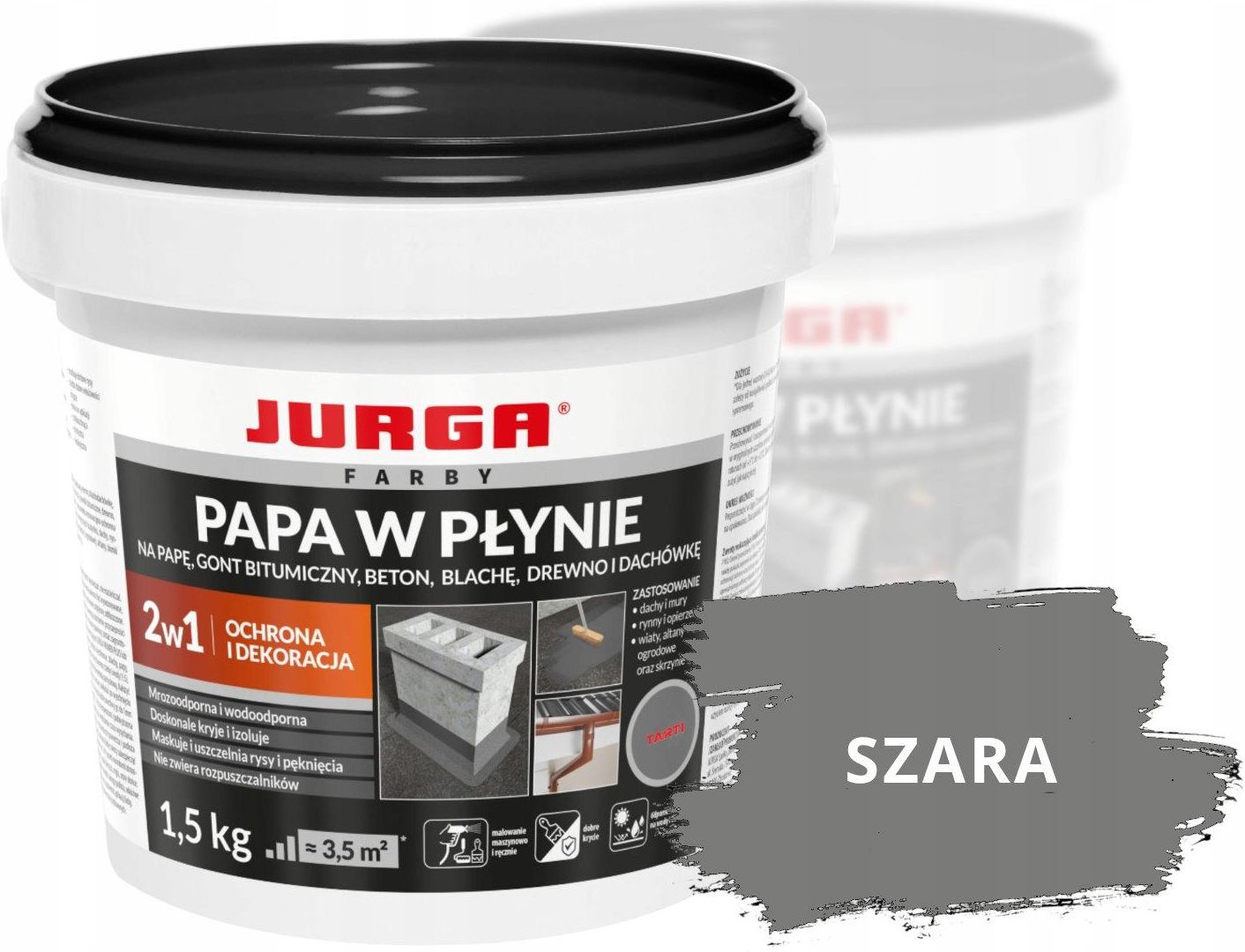 JURGA PAPA W PŁYNIE 1,5KG SZARY Produkt o właściwościach hydroizolacyjnych i dekoracyjnych, przeznaczony do renowacji powierzchni takich jak mury, przyziemia ścian zewnętrznych budynku, dachy, opierzenia, elementy architektury ogrodowej: altany, domki i skrzynie na narzędzia, wiaty itp. Posiada doskonałą przyczepność do różnych powierzchni, w tym: beton, tynk, papę, blachę trapezową, eternit, blachodachówkę, dachówkę cementową i ceramiczną, powłoki bitumiczne, drewno, blachę ocynkowaną, gazony. Farba posiada bardzo dobre właściwości kryjące, wysoką elastyczność oraz po wyschnięciu tworzy powłokę odporną na działanie wody, mrozu, UV. Produkt jest łatwy w aplikacji, szybkoschnący, nie zawiera rozpuszczalników. Papę w płynie cechuje: uniwersalność – możliwość stosowania na wielu podłożach, bezpieczny skład– brak rozpuszczalników, krótki czas schnięcia – średnio 2-3 h przy 20 stopniach Celsjusza gwarantuje brak przestojów w pracy, pełne utwardzenie powłoki następuje po 12-24h w zależności od warunków zewnętrznych,nie wymaga przygotowania – jest gotowy do użycia od razu po otwarciu opakowania, łatwa aplikacja, możliwość stosowania w temperaturach od +10 do +25 stopni C. duża elastyczność i przyczepność,właściwości kryjące, wysoka odporność na warunki atmosferyczne ,wodoodporność, zdolność mostkowania rys. Papa w płynie jest produktem wielozadaniowym, który pomoże zabezpieczyć ściany i dach domu przed uszkodzeniami poprzez wytworzenie wodoszczelnej powłoki. Tym samym uchronimy się przed kosztownymi remontami. Ale nawet jeśli budynek już nosi ślady upływu czasu i widać zniszczenia, dzięki zastosowaniu papy można go łatwo i skutecznie poddać renowacji. Zastosujemy papę też do uszczelniania pęknięć czy przecieków w miejscach trudnodostępnych. W wielu sytuacjach możemy tym preparatem skutecznie zastąpić tradycyjną papę tworząc bezspoinową powłokę hydroizolacyjną. Papa w płynie – właściwości Papa w płynie charakteryzuje się świetną przyczepnością do powierzchni takich jak beton i tynk, ale także papa, eternit czy blachodachówka wykorzystywane na dachach. Jest bardzo elastyczna i dobrze kryje dzięki czemu stosowanie jest o wiele prostsze i skuteczniejsze. Zwłaszcza, że w odpowiednich warunkach papa również szybko schnie nie wydłużając nadmiernie czasu potrzebnego do renowacji. Dla użytkowników wrażliwych na kwestie ekologiczne zaletą z pewnością będzie brak rozpuszczalników w składzie, co przekłada się na niższą szkodliwość względem otoczeni, jak również naszego zdrowia. Zastosowania papy w płynie Papa w płynie to produkt stosowany do odnawiania powierzchni, przede wszystkim dachów, murów i przyziemi ścian zewnętrznych. Znajduje zastosowanie również w ogrodzie do zabezpieczenia altan, domków i wiat. Chroni budynek przed negatywnym działaniem czynników atmosferycznych. To wszystko sprawia, że papę uznajemy za uniwersalne rozwiązanie dla budownictwa mieszkaniowego i nie tylko. Oprócz ochrony powierzchni ma ona właściwości dekoracyjne Sposób użycia papy w płynie Przed zastosowaniem powierzchnię, którą zamierzamy poddać zabiegowi należy oczyścić, odtłuścić, wyrównać i wysuszyć. Podłoża chłonne dodatkowo gruntujemy dedykowanymi preparatami. Na chwilę przed nałożeniem, papę należy dokładnie wymieszać do uzyskania jednolitej konsystencji. Pamiętajmy, że nie należy jej rozcieńczać (o ile nie używamy produktu do gruntowania lub aplikacji metodą natryskową). Sam proces nanoszenia możemy wykonywać na kilka sposobów – pędzlem, wałkiem lub metodą natryskową. Wałek będzie odpowiedni w przypadku podłoża nie zniszczonego, a więc też gładkiego i równego. Pędzel sprawdzi się przy powierzchniach, do których dostęp jest utrudniony, a także podczas napraw i przy uszczelnianiu. Natrysk to dobra metoda, gdy mamy do czynienia z dużą powierzchnią, co pozwala szybciej i przy mniejszym nakładzie fizycznym, wykonać aplikację. Przy czym istotne jest, że minimum, które gwarantuje skuteczność powłoki hydroizolacyjnej, to 2 warstwy (całkowita grubość powłoki min. 1mm). W przypadku malowania dekoracyjnego wystarczy pojedyncza warstwa. Każda z warstw musi wyschnąć przed nałożeniem kolejnej. Papę w płynie nakładamy przy temperaturze pomiędzy 10 a 25 stopni Celsjusza i zabezpieczamy przed warunkami zewnętrznymi do czasu utwardzenia. Najlepiej sprawdzić pogodę przed aplikacją i unikać upałów, niskich temperatur oraz deszczu. Stosując papę należy pamiętać o wymaganych zasadach BHP (ubranie robocze, rękawiczki i okulary ochronne).