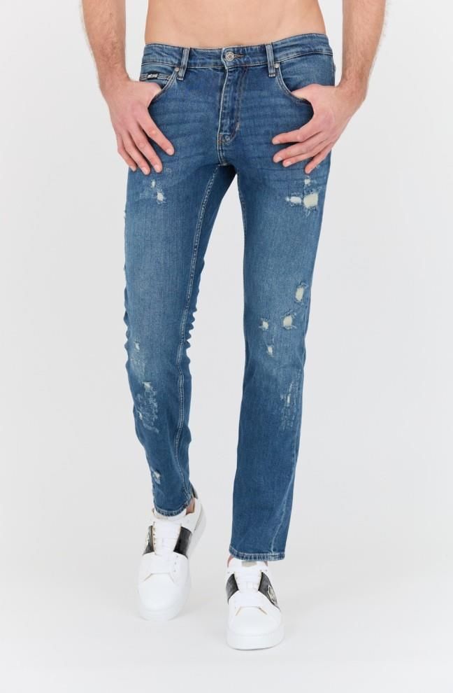 Niebieskie męskie jeansy Slim, marki Just Cavalli.Wymiary modela: wzrost: 190 cm, klatka: 107 cm, pas: 93 cm.Model ma na sobie produkt w rozmiarze: 33.Wymiary produktu w rozmiarze 33: Szerokość w pasie: 42 cm, długość nogawki od zewnątrz: 104 cm, długość nogawki od wewnątrz: 83 cm.