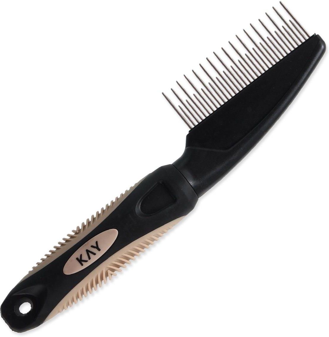 Przeznaczenie grzebienia KAY z podwójnymi zębami dla psaDzięki mocnym i wytrzymałym zębom o dwóch różnych długościach, grzebień skutecznie rozczesuje zarówno sierść jak i podszerstek. Zaokrąglone na końcach zęby chronią skórę zwierzęcia przed podrażnieniem. Cechy grzebienia KAY: długość: 21cm Materiał użyty do produkcji: tworzywo sztuczne/stal nierdzewna Kolor: czarny/szary Charakterystyka grzebienia KAY z podwójnymi zębami dla psaGrzebień zaprojektowany w nowoczesnym stylu, w modnym, stonowanym kolorze Akcesorium pielęgnacyjne o harmonijnym i dynamicznym kształcie, które z pewnością przypadną do gustu użytkownikom. Grzebień KAY posiada uchwyt, który zapewnia większą wygodę użytkowania i idealnie leży w dłoni, dzięki ergonomicznemu kształtowi. Zalety grzebienia KAY z podwójnymi zębami dla psa: Wysoka jakość wykonania – tworzywo ABS, szczególnie odporne na upływ czasu Wygodny uchwyt, zwiększający wygodę użytkowania, pokryty powłoką z gumy termoplastycznej Miękkie i przyjemne w dotyku wykończenie Metalowe elementy wykonane ze stali nierdzewnej Dane producenta:Plaček Pet Products s.r.o.Revoluční 1381/III290 01 PoděbradyCzech RepublicEmail: info@placek.cz