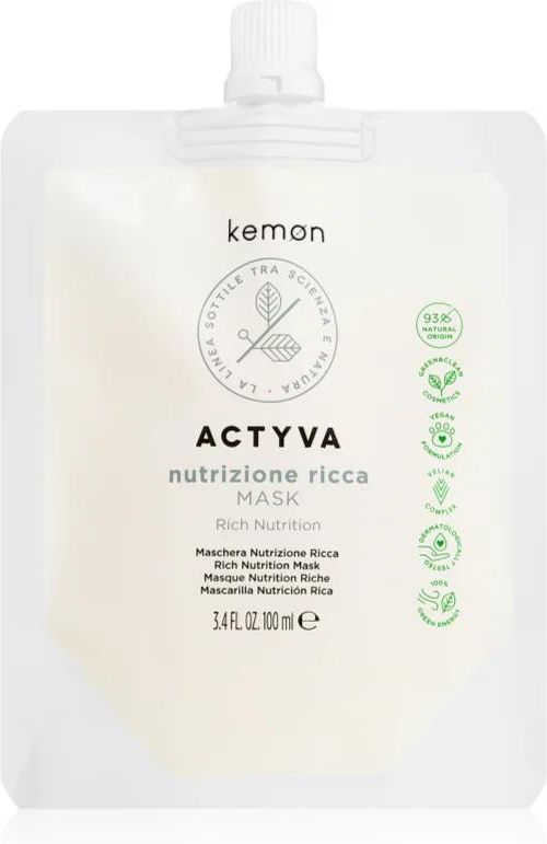 KEMON ACTYVA NUTRIZIONE RICCA MASK - Maska intensywnie nawilżająca włosy. Maska intensywnie nawilżająca włosy, zapewnia właściwe odżywienie włosom mocno przesuszonym u nasady. Ułatwia rozczesywanie i układanie. Nadaje włosom intensywny połysk i miękkość. Po zastosowaniu włosy stają się jedwabiste i miękkie w dotyku. Kluczowe składniki: Tłuszcze zawarte w oliwie z oliwek, proteiny owsa. Sposób użycia: Nałożyć na umyte i dokładnie osuszone ręcznikiem włosy, wmasowując produkt pasmo po paśmie. Rozczesać, aby rozprowadzić preparat. Pozostawić na 5-10 minut. Dokładnie masując, doprowadzić do wytworzenia emulsji a następnie starannie spłukać.