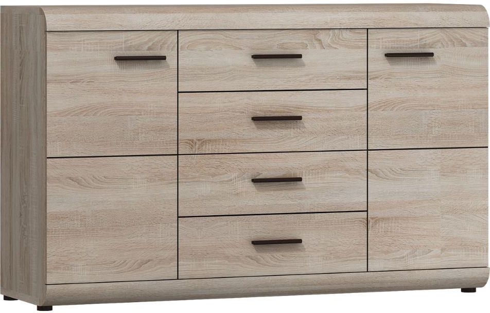 Komoda z kolekcji Link to praktyczne i eleganckie rozwiązanie do salonu, sypialni lub jadalni, utrzymane w ciepłej kolorystyce dębu sonoma.Wyposażona w cztery pojemne szuflady i dwie szafki z półkami, oferuje dużą przestrzeń do przechowywania odzieży, dokumentów lub domowych drobiazgów.Subtelne …