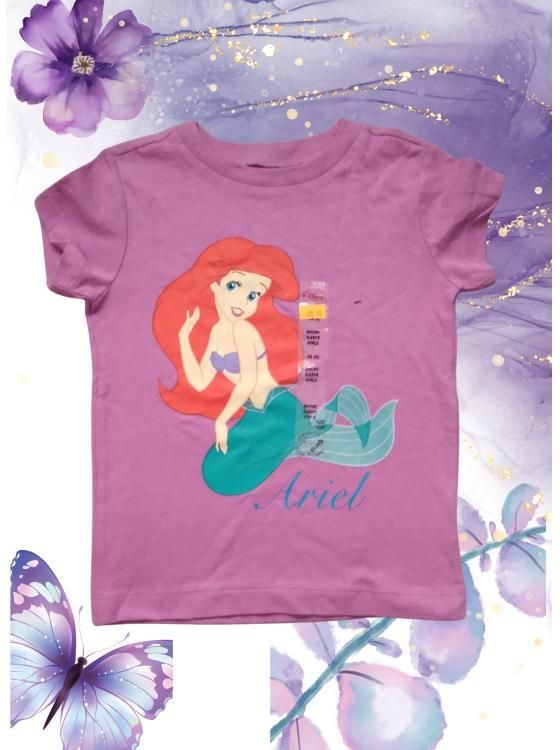 Bawełniana koszulka dziewczęca z nadrukiem Arielki z bajki „Mała Syrenka” od Disney. W pięknym fioletowym kolorze, z krótkim rękawem i wygodnym krojem – idealna na co dzień, do przedszkola czy na wakacje. Rozmiar 5–6 lat. Oryginalny produkt licencjonowany Disney – doskonały wybór dla małej fanki podwodnych przygód!
