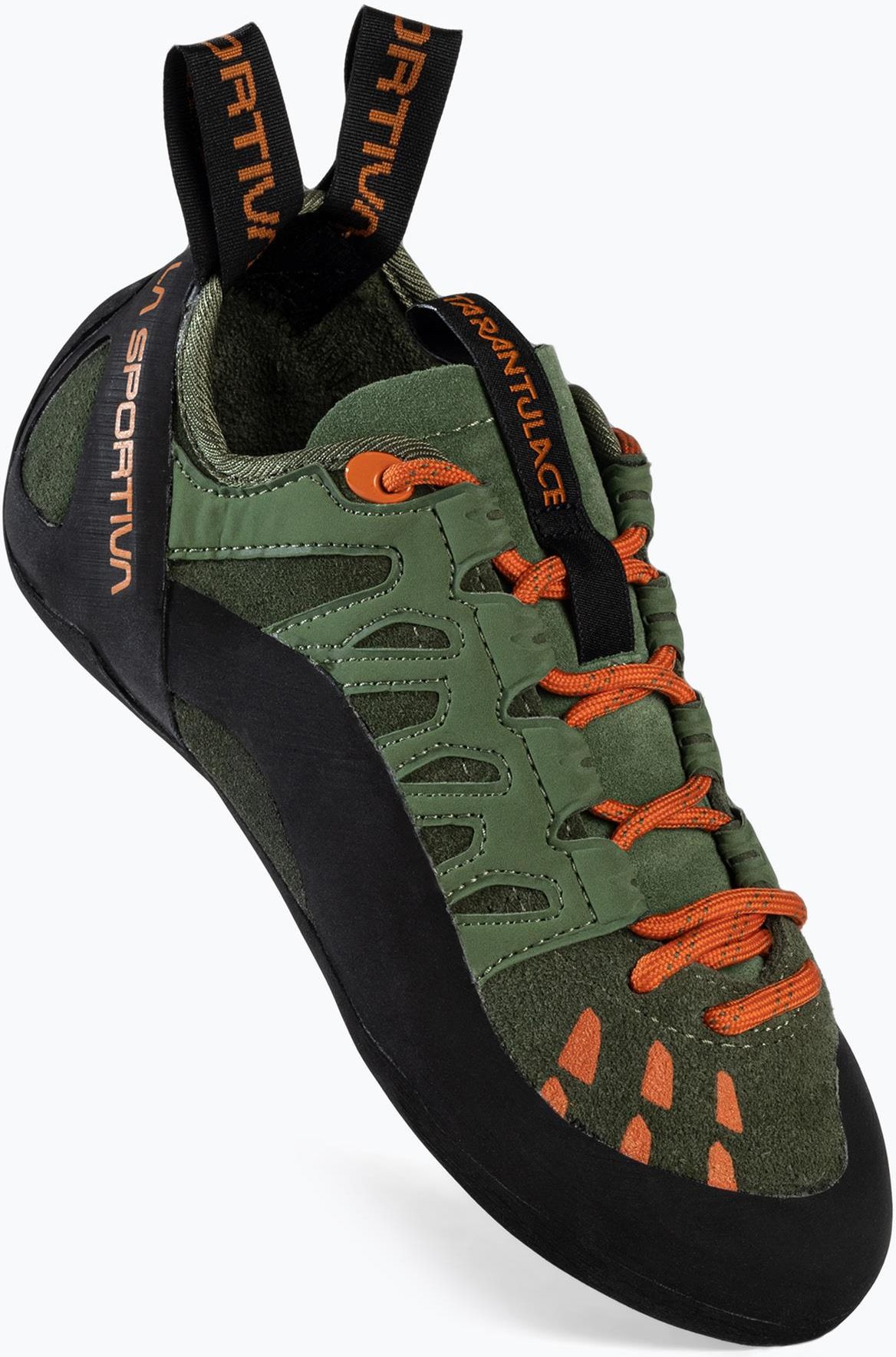 La Sportiva Tarantulace to wspinaczkowe buty, które zostały zaprojektowane z myślą o początkujących wspinaczach, chcących osiągnąć swoje pierwsze sukcesy w boulderingu, na ściankach i skałkach. Niewielka waga butów sprawia, że są bardzo lekkie i poręczne. Model La Sportiva Tarantulace wyposażone są w okrągły nosek , który zapewnia lepszą kontrolę nad ruchami stopy podczas wspinaczki. Wysoka sztywność butów pozwala na skuteczne przenoszenie siły na stopę i kontrolowanie ruchów na trudnych drogach wspinaczkowych. Ważnym elementem technologicznym zastosowanym w tych butach jest podeszwa FriXion® Black - specjalna mieszanka gumy, która oferuje doskonałą przyczepność do podłoża. Dzięki temu wspinaczka staje się bardziej efektywna, a obuwie pozwala na lepszą kontrolę ruchów na trudnym terenie.