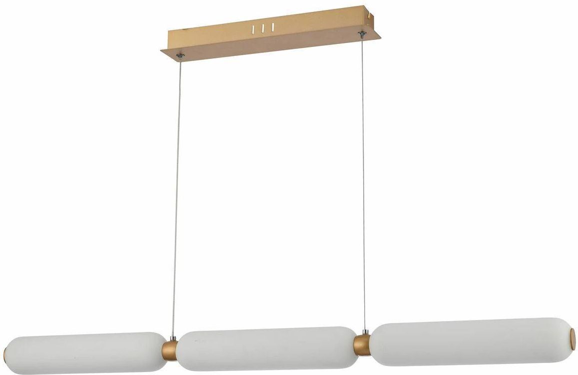 Lampa wisząca Catkin złoty Rodzaj: Lampa wisząca Kolor: złoty malowany Ilość źródeł światła: 3 Rodzaj gwintu: zintegrowany LED Maksymalna moc: 8W Klasa energetyczna: F klasa ochronności: I barwa światła (K): 4000 strumień świetlny (Lm): 1920 Wysokość (cm): 120 Szerokość (cm): 92.5 Głębokość (cm): 7 Materiał wykonania: metal IP 20 kolor klosza: biały materiał klosza: szkło Lampa wisząca LED złoty do oświetlenia pomieszczeń uniwersalny i minimalistyczny styl