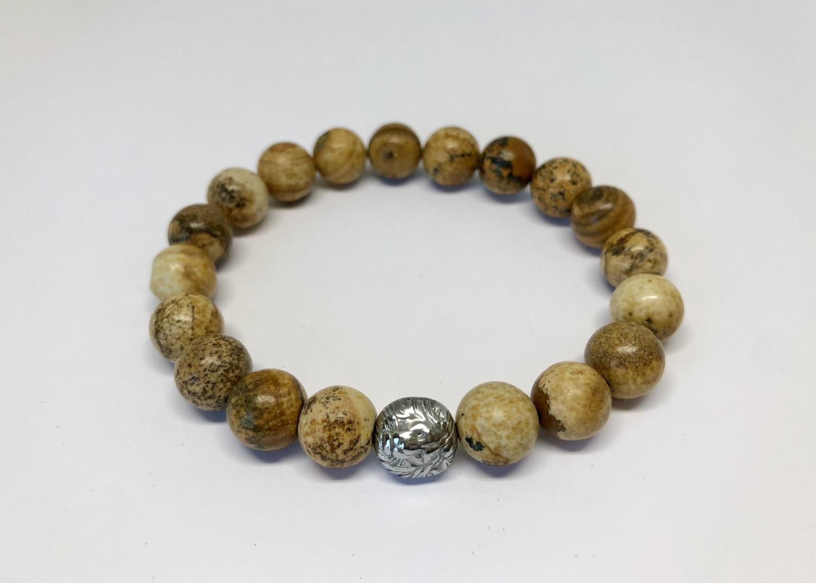 Kolekcja: For men Materiał: Agat obrazkowy (kamień półszlachetny), gumka Dodatki: Hematyt Średnica kulek: 10 mm Dostępne rozmiary: XS (17 cm), S (18 cm), M (19 cm), L (20 cm), XL (21 cm) Bransoletka jest wykonana z kamieni półszlachetnych oraz hematytu, założonych na gumkę. Jest łatwa do założenia i zdejmowania. Pasuje do strojów eleganckich oraz sportowych. Świetnie się nadaje na prezent.