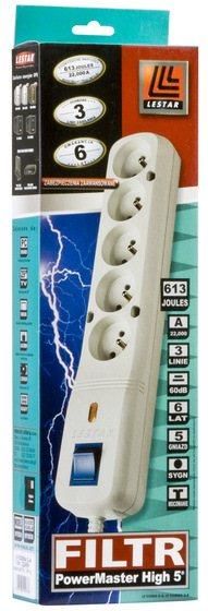 LESTAR Listwa przeciwprzepięciowa LF-530WA, 3L EMI/RFI, 2.5m, czarna Producent: Lestar Kod producenta: 1966000279 Kod EAN: 5901966000279 UWAGA! Ważna Informacja! W naszych aukcjach proszę sugerować się opisem - parametry i tytuł mogą posiadać błędy spowodowane niepoprawnym połączeniem z katalogiem Allegro. Filtr przeciwzakłóceniowy LF 530WA 5+ Niezbędne zabezpieczenie twojego sprzętu elektroniczenego przed przepięciami i zakłóceniami w sieci. Co czyni grupę filtrów LESTAR Power Master High liderami w swojej klasie? Pełna ochrona przeciwprzepięciowa 3 lini zasilania z podwyższonymi wartościami 480 Jouli i 15,100 Amper zabezpieczenia. Układ filtrujący zakłócenia symetryczne i niesymetryczne do 60dB, 6 lat gwarancji w standardzie.Zalecane do: komputerów biurowych typu PC, komputerów domowych typu PC, telewizorów do 29 ", drukarek laserowych, większych domowych urządzeń elektrycznych, odtwarzacze CD, kasy fiskalne. Liczba gniazd typu E: 5 Długość przewodu zasilającego: 2.5 m Kolor: Czarny Wtyczka: Europejska Ochrona linii danych: Nie Zabezpieczenia / filtry: Przeciwprzepięciowe Włącznik: Tak Montaż: Ściana Pozostałe porty we/wy: Brak Wymiary: - Szerokość: 66 [mm]- Długość: 327 [mm]- Wysokość: 45 [mm] Waga: 515 g Pozostałe parametry: - Napięcie znamionowe: 10A - Prąd znamionowy: 10A (2300 W) - Max. obciążenie: 613 J - Absorbcja energii: 22,0 kA (8/20 ľs) - Max. prąd impulsu: <15ns - Czas reakcji: 100kHz/35MHz-60dB; 35MHz/60Hz-50dB