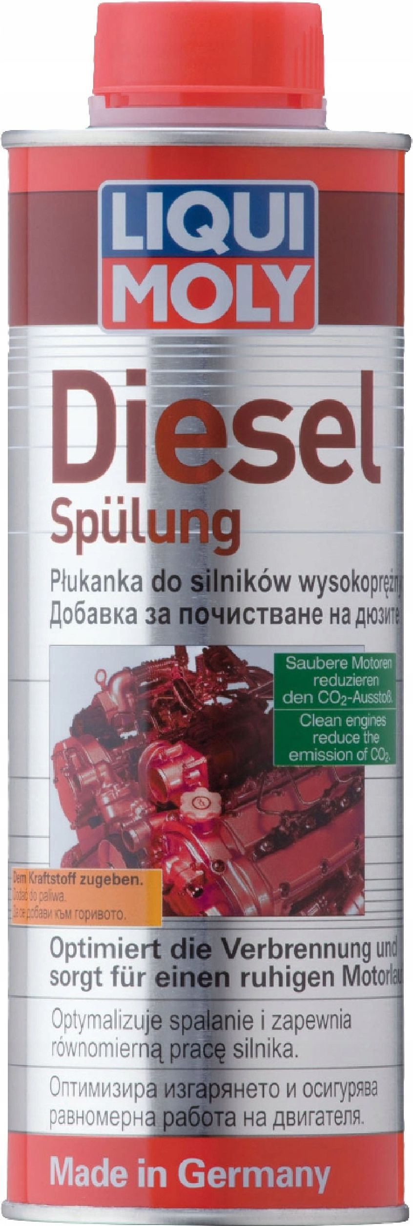 Liqui Moly Diesel Spulung - czyści wtryskiwacze diesla 500ml Preparat do czyszczenia wtryskiwaczy Diesela Liqui Moly Diesel Spulung 500ml Środek przeznaczony do wszystkich silników wysokoprężnych. Rozwiązuje problemy związane z nierównomierną pracą silnika. W większości przypadków już jedno oczyszczanie przy użyciu tego środka przywraca do pracy nawet bardzo zanieczyszczony układ wtryskowy. Czyste wtryskiwacze oraz pompa wtryskowa zapewniają optymalne osiągi oraz równomierna pracę silnika. Właściwości usuwa osady jakie gromadzą się we wtryskiwaczach, pompie wtryskowej, w komorze spalania podwyższa liczbę cetanową likwiduje stuki na biegu jałowym oraz zapewnia równą i spokojną pracę silnika optymalizuje wartości badanych spalin zapobiega korozji Opakowanie : puszka 500ml Sposób użycia Użycie zapobiegawcze : dolać do paliwa zapobiegawczo stosować 1 opakowanie na 75 litrów oleju napędowego W przypadku nagłych problemów z silnikiem : odłączyć przewody paliwowe i wprowadzić bezpośrednio do pojemnika pozwolić aby środek zasysany był bezpośrednio przez pompę paliwową