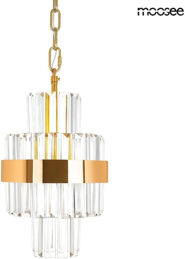 Wyjątkowa, luksusowa lampa wisząca powstała w wyniku połączenia delikatnego, transparentnego kryształu oraz stali w błyszczącym złotym kolorze. Głównym elementem dekoracyjnym jest klosz o nieregularnym kształcie oraz piękny ozdobny, złoty łańcuch. Światło pięknie przenika przez kryształy, dając …