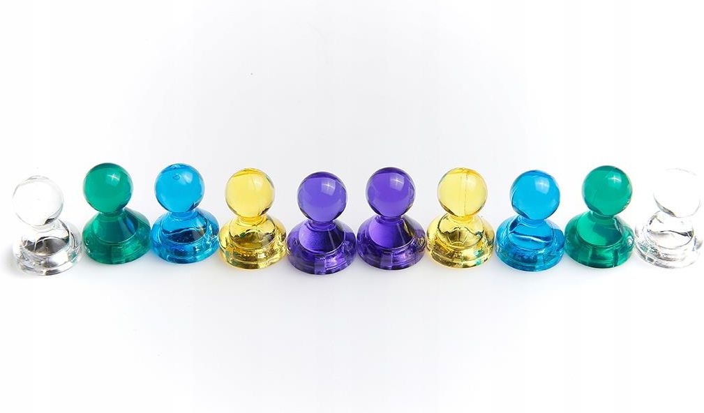 Aukcja dotyczy 10 sztuk Pionków magnetycznych 15x21 W skład kompletu wchodzą: 2 pionki w kolorze fioletowym, 2 pionki w kolorze niebieskim, 2 pionki w kolorze przezroczystym 2 pionki w kolorze zielonym, 2 pionki w kolorze żółtym. Parametry Pionka: Średnica: 15 mm Wysokość: 21 mm Waga: 4 g - do sprawdzenia Materiał: Akryl W pionku zastosowano magnes: Neodymowy Udźwig: do 20 kartek A4 ( udźwig zależy od gramatury papieru oraz grubości i klasy stali z jaką współpracuje magnes) Pionek magnetyczny w obudowie plastikowej idealnie sprawdza się do przytrzymywania kartek papieru na tablicach magnetycznych, sucho-ścieralnych, kredowych, lodówkach czy innych metalowych powierzchniach. Uwaga: Udźwig magnesu jest uzależniony od czynników takich jak grubość, rodzaj i odległość ferromagnetyka oraz temperatura, kierunek siły, powierzchnia styku. Zalecamy testowanie magnesów w konkretnych warunkach, celem sprawdzenia faktycznego udźwigu magnesu.