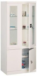 Korpus metalowej szafy lekarskiej wykonany z blachy gr. 0,8 mm. Drzwi szafy lekarskiej przeszklone, półki wykonane ze szkła bezpiecznego , przestawne co 25 mm. Uchwyt drzwiowy w metalowej szafie lekarskiej z zamkiem zabezpieczającym ryglującym drzwi w dwóch punktach. Dolna półka zabudowana - drzwi …