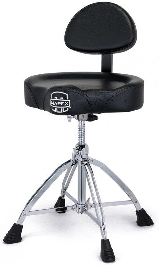DESCRIPTION With its 17" x 4" saddle-style cushioned top and adjustable back rest, the T875 throne is the pinnacle of support and comfort. The sloped leg openings of the biomechanically shaped seat provide a free range of motion while the raised center and back edge help the player to maintain balance. The addition of a 4th oversize double-braced leg makes this throne extremely stable. FEATURES The sloped leg openings of biomechanically shaped seat provide a free range of motion while the adjustable back rest provides needed support for the spine. A simple and strong clamp-mount ensures an ultra-secure seat to spindle connection The 19" to 25" threaded steel spindle height adjustment with Spindle Lock make it both secure to sit on and convenient to adjust. The double-braced legs with Extra Large Slip-Proof Feet provide durability and stability. SPECS 17" x 4" Thick Saddle-Style Cushioned Seat Soft Vinyl Covering and Adjustable Back Rest Ultra-Secure Clamp Mount 19" to 25" Threaded Steel Spindle Height Adjustment with Spindle Lock Double-Braced Quad Legs w/extra large slip-proof feet