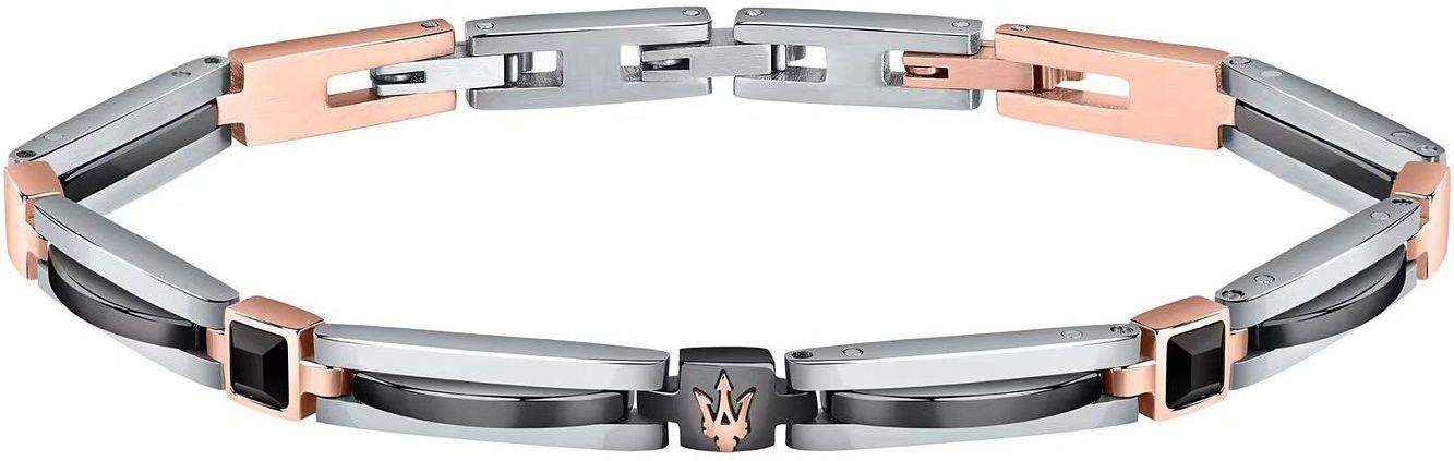 Szczegóły biżuteriiDługość: 210 mmMateriał: stal stopowaPodsumowanieBransoletka Maserati (numer artykułu: JM223ATZ19) to stylowy dodatek o długości 210 mm. Posiada praktyczne zapięcie na zatrzask i charakteryzuje się atrakcyjnym designem z dwukolorowymi akcentami w kolorze srebrnym, różowego złota i czarnym.Komfort noszeniaDzięki praktycznemu zapięciu na zatrzask bransoletka (numer artykułu: JM223ATZ19) jest łatwa do zakładania i zdejmowania oraz wygodna w noszeniu. Delikatnie przylega do nadgarstka i dobrze dopasowuje się do różnych rozmiarów nadgarstków.Szczegóły kolorystyczneDwukolorowy srebrny z różowym złotem i czarnymi akcentamiRésuméBransoletka Maserati (numer artykułu: JM223ATZ19) to nie tylko element biżuterii, ale oświadczenie. Unikalny design i wysoki komfort noszenia sprawiają, że jest to niezbędny dodatek dla mężczyzn dbających o styl. nowoczesna bransoletka wykonana z polerowanej stali nierdzewnej i ceramiki, szerokość 5 mm, długość 21 cm, pojedyncze ogniwa wyśrodkowane czarną ceramiką, połączone kwadratowymi elementami wykonanymi ze stali nierdzewnej pokrytej jonami różowego złota, inkrustowane czarne kamienie, logo Maserati Trident w kolorze różowego złota, wygodne składane zapięcie z napisem, szybkozłączka do regulacji długości Biżuteria Maserati: idealne połączenie elegancji i sportowego charakteru: mieszanka włoskiego stylu i pasji do jazdy, która nie zna rywali.