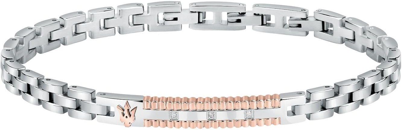 oszałamiająca bransoletka wykonana z polerowanej stali nierdzewnej, szerokość 6,5 mm, długość 18,5 cm + 3 cm przedłużenia, środkowy element częściowo pokryty jonami różowego złota, z delikatnym wzorem i logo trójzębu Maserati, wysadzany 3 błyszczącymi diamentami, wygodne składane zapięcie z logo