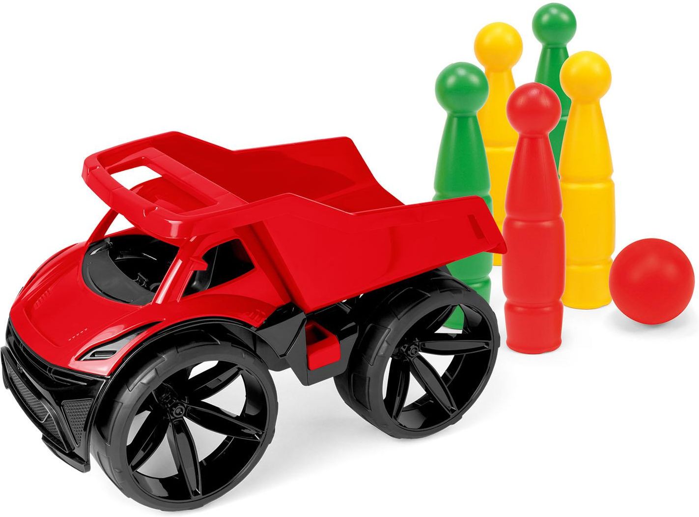 Maximus Wywrotka to duży i solidny pojazd, który doskonale sprawdzi się podczas zabawy w domu, ogrodzie czy piaskownicy. Wywrotka Maximus w połączeniu z kompletem 5 kręgli w kolorach żółtym, czerwonym i zielonym oraz piłką to doskonały zestaw dla aktywnych maluchów. Duży, solidny pojazd może przewozić kręgle na „tor bowlingowy#8221;, a gdy dotrze na miejsce, czas rozpocząć ekscytującą grę w kręgle! Dzieci mogą ustawiać kręgle w różnych konfiguracjach i próbować strącić je za pomocą lekkiej piłki. Mogą też tworzyć własne scenariusze zabawy – np. organizować turniej kręgli lub używać wywrotki do transportu sprzętu sportowego na placu budowy. Dzięki intensywnym kolorom zabawki pobudzają wyobraźnię i zachęcają do ruchu. Solidna konstrukcja oraz wysokiej jakości materiały sprawiają, że zestaw jest trwały i idealnie nadaje się do zabawy w domu, ogrodzie czy na podwórku. To świetna propozycja dla małych budowniczych i sportowców, którzy uwielbiają aktywną i kreatywną zabawę!