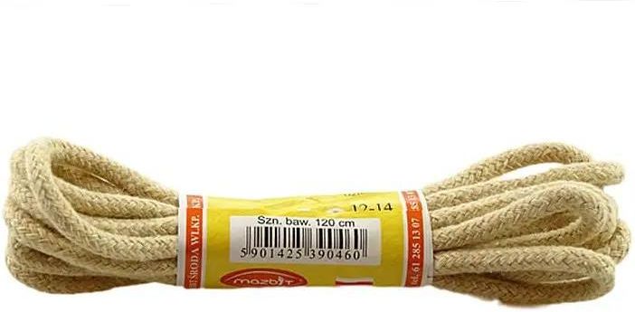 Jasnobeżowe, okrągłe grube, sznurówki do butów, 60 cm, Mazbit idealne do nawlekania 6-8 oczek w cholewce obuwiowej. Szerokość sznurówek 5 mm.