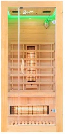 Sauna na podczerwień Mazur model MO-EA1R wymiary 90x90x190 cm. Sauna infrared wykonana z drewna jodły kanadyjskiej. Sauna zawiera koloroterapie (LED – zamontowane w dachu): tak (siedem rodzajów kolorów). Sauna została wyposażona w jonizację powietrza, panel sterowania, radio. czujnik temperatury.