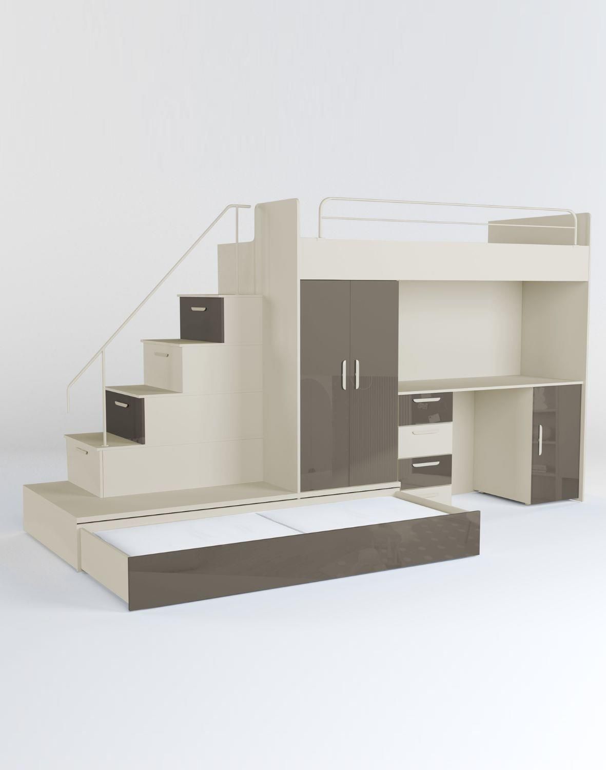 Zestaw Raj 5 to kompleksowe rozwiązanie do pokoju dziecka lub nastolatka.Łączy wygodne miejsce do spania, praktyczne biurko, pojemną szafę oraz bezpieczne schodki z funkcją przechowywania, dodatkowo posiada wygodne siedzisko oraz wysuwany materac.To nie tylko oszczędność miejsca, ale i maksymalne wykorzystanie przestrzeni w atrakcyjnej formie.W skład zestawu wchodzą:- łóżko piętrowe (na górze) ze stelażem i materacem,- biurko z szufladami i szafką (w centralnej części),- pojemną szafę ubraniową,- praktyczne schody z szufladami w stopniach – z możliwością montażu po lewej lub prawej stronie,- wygodne siedzisko,- wysuwane dodatkowe miejsce do spania - rozkładany materac piankowy w dolnej szufladzie ( 75 cm x 180 cm) o grubości 7 cm.Cechy i zalety:- Bezpieczeństwo – barierki na górnym łóżku i przy schodkach.- Wysoka jakość – solidna płyta laminowana i fronty MDF na wysoki połysk.- Modny design – nowoczesne wykończenie w atrakcyjnych kolorach.- Praktyczność – biurko, szafa i schodki z funkcją przechowywania w jednym meblu.- Udźwig górnego łóżka: do 75 kg.- Stelaż łóżka jest wykonany z ramy ze sklejki bukowej dzięki czemu jest on bardzo wytrzymały. Stelaż posiada 21 listew sprężynujących. Raj 5 dostępny jest w 8 modnych wariantach kolorystycznych, szafki są wykończone na wysoki połysk:- kaszmir + fiolet- kaszmir + biały- kaszmir + beż- kaszmir + czarny - kaszmir + szary- kaszmir + niebieski- kaszmir + róż- kaszmir + zielony To doskonały wybór dla chłopca i dziewczynki – praktyczny, nowoczesny i bezpieczny zestaw, który odmieni każdy pokój dziecięcy lub młodzieżowy.Model objęty jest 2 letnią gwarancją producenta.Produkt dostarczymy do Państwa BEZPŁATNIE pod wskazany adres na terenie całego kraju.Mebel wymaga samodzielnego montażu, zgodnie z załączoną instrukcją.Co WAŻNE: zgodnie z prawem i naszymregulaminemmają Państwo pełne prawo do zwrotu nieużywanych towarów, jeśli nie spełnią one Państwa oczekiwań. Wymiary:
