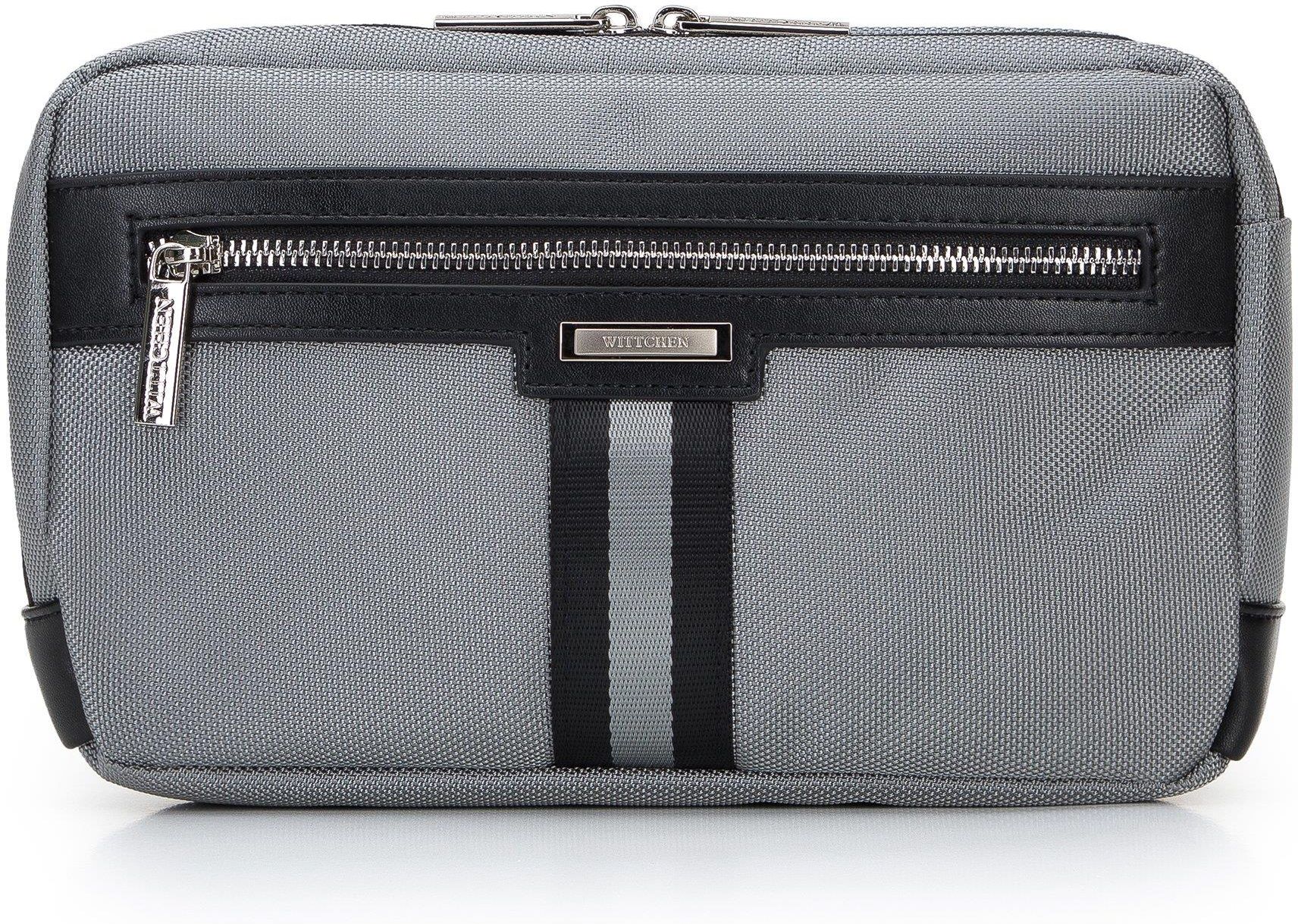 Męska torba na pas. Ta torebka nerka stylowo dopełni zarówno sportowe, jak i codzienne stylizacje. Została wykonana z wysokiej jakości poliestru o delikatnym połysku. Zamykana jest na suwak, który otwiera się na tyle szeroko, że wygodnie będzie z niej korzystać. Z przodu znajduje się ozdobna tasiemka. Wstawki ze skóry naturalnej dodają jej elegancji. W środku zmieścisz portfel, telefon, zapasowe rękawiczki i kilka drobiazgów – w sam raz na wycieczkę rowerową, spacer lub krótkie zwiedzanie. Męska torebka nerka z tasiemką to ponadczasowy dodatek, który warto mieć w swojej szafie.Nasza rada: noś ją zamiennie z ulubioną małą torbą.Wewnątrz: trzy kieszenie, w tym jedna na suwak; ciemna podszewka w logo WITTCHEN. Dodatkowo: poliester; skóra naturalna; zapinana na suwak; kieszeń od strony ciała zamykana na suwak; kieszeń z przodu zamykana na suwak; ozdobna tasiemka; regulowany pasek zapinany na klamrę.