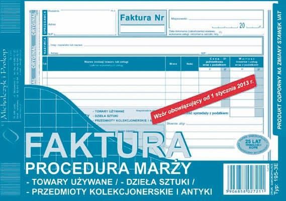 195-3E FAKTURA PROCEDURA MARŻY - TOW. UŻYWANE/ - DZ. SZTUKI/ - PRZEDM. KOLEKC. I ANTYKI * format:A5 * rodzaj papieru:samokopiujący * zastosowanie: faktury i inne dokumenty wynikające z przepisów o podatku od towarów i usług * oprawa:bloczek 80 kartek * druk:jednostronny (oryginał + kopia)