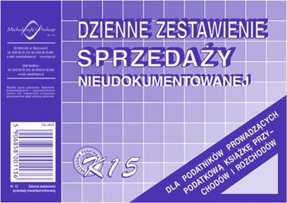 K15 DZIENNE ZESTAWIENIE SPRZEDAŻY NIEUDOKUMENTOWANEJ (DLA PODATNIKÓW PROWADZĄCYCH PODATKOWĄ KSIĘGĘ PRZYCHODÓW I ROZCHODÓW) * format:A6 * rodzaj papieru:offsetowy * zastosowanie:podatnicy prowadzący księgę przychodów i rozchodów * oprawa:bloczek 50 kartek * druk:jednostronny