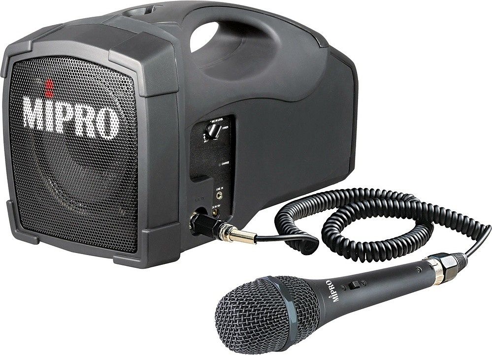 MIPRO MA 101 C Przenośne urządzenie nagłośnieniowe MA 101 z przewodowym mikrofonem MM 107, Odbiornik bateryjny MA 101: z głośnikiem szerokopasmowym 5”, Moc 30W RMS (42W Max), Wejście mikrofonowe Mic In Jack TS ¼” z regulacją poziomu Mic In Level, Wejście liniowe Line In mini Jack, Pasmo …