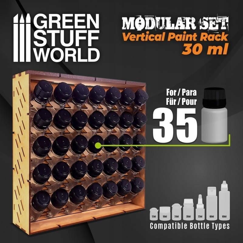 Modułowy stojak na farbę - PIONOWY Modułowy organizer na pojemniki na farby wykonany z wysokiej jakości płyty MDF. Wiele z tych modułów można łączyć poziomo i pionowo w celu zwiększenia wydajności. Jest dostarczany w stanie niezmontowanym, ale jest bardzo łatwy w montażu. W przypadku chęci wzmocnienia zalecamy użycie standardowego białego kleju PVA (kleju do drewna). Umożliwia przechowywanie butelek do góry nogami. Zawiera łączniki do łączenia wielu stojaków. Możliwość przykręcenia do ściany. Pojemność: 35x 30ml butelek. Kompatybilny z: 12ml, 10ml, 24ml, 30ml, 22ml, 60ml Rozmiar: 30x28x8,2 cm * Ta pozycja nie obejmuje pędzli ani pojemników do malowania. Ten element musi być złożony, ale zawiera instrukcję montażu.*Drewno to organiczny materiał pochodzenia naturalnego, który może mieć różne odcienie koloru lub wykończenia. Ta różnica nie będzie uważana za wadę towaru.