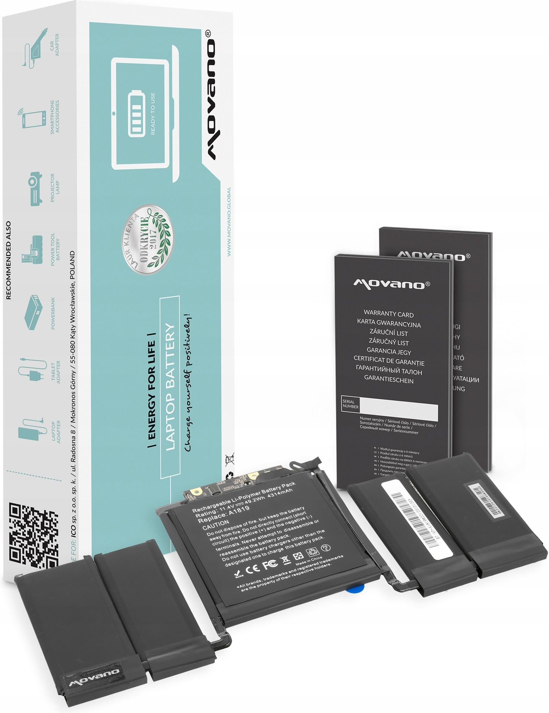 Dedykowany akumulator / bateria marki Movano do laptopa to jakość, wydajność i bezpieczeństwo w atrakcyjnej cenie. Kontrola procesu produkcji przebiega aż na 6 poziomach, dzięki czemu otrzymujesz produkt wysokiej klasy, trwały i niezawodny. Jakość tej baterii potwierdzają tysiące użytkowników w Polsce, Czechach i na Słowacji oraz zdobyte wyróżnienie Laur Klienta. Dołącz do grona ponad 150 tys. zadowolonych klientów. Parametry Techniczne: Pojemność: 4314 mAh (49.2 Wh) Napięcie: 11.4V Ilość ogniw: 3 ogniwa Li-polymer Marka ogniw: Zhuoneng Certyfikat: CE, RoHS Zabezpieczenie przed: przepięciem, przegrzaniem, zwarciem, przeciążeniem prądowym, głębokim rozładowaniem oraz przeładowaniem W zestawie: bateria, instrukcja obsługi, karta gwarancyjna Akumulator / bateria Movano do laptopa to wysokogatunkowe ogniwa litowo-jonowe bez efektu pamięci faktyczna deklarowana pojemność znacznie wolniejszy spadek nominalnej pojemności w porównaniu do innych tańszych zamienników wbudowany inteligentny układ bezpieczeństwa, chroniący przed przepięciem, przegrzaniem, zwarciem, przeciążeniem prądowym, głębokim rozładowaniem i przeładowaniem znacznie wolniejszy spadek nominalnej pojemności w porównaniu do innych tańszych zamienników niska podatność na samoistne rozładowania niezawodny i długotrwały czas pracy między kolejnymi cyklami ładowania Kompatybilne z Apple MacBook Pro 13 A1706, Apple MacBook Pro 13 A1706 (EMC 30710, Apple MacBook Pro 13 A1706 (EMC 3163), Apple MacBook Pro 13 A1706 (koniec 2016), Apple MacBook Pro 13 A1706 (Late 2016), Apple MacBook Pro 13 A1706 (Mid 2017), Apple MacBook Pro 13 A1706 (połowa 2017), Apple MacBook Pro 13 A1706 Touch Bar, Apple MacBook Pro 13 MLH12LL, Apple MacBook Pro 13 MLH12LL/A, Apple MacBook Pro 13 MLH12LL/A*, Apple MacBook Pro 13 MPXV2LL, Apple MacBook Pro 13 MPXV2LL/A, Apple MacBook Pro 13 MPXV2LL/A*, Apple MacBook Pro 13 Retina A1706 020-01705, A1819 O nas ICO jest właścicielem marek Movano Premium, Movano i Mitsu. W bogatym asortymencie jej produktów znajdziemy m.in. baterie oraz zasilacze do laptopów i tabletów, takich jak Acer, Asus, Dell, Lenovo, Samsung, Sony i wiele innych. Rozsądna cena, wysoka jakość i fakt, że ICO zapewnia dodatkowe wsparcie nie tylko techniczne, to powody, dla których klienci pokochali te marki. Jeśli szukasz wysokiej klasy zamienników, na pewno znajdziesz tu coś dla siebie, bez względu na zasobność Twojego portfela. Świetne opinie, doskonała obsługa, natychmiastowa realizacja zamówień – to tylko niektóre atuty firmy ICO, nie bez powodu docenione statusem Super Sprzedawcy.