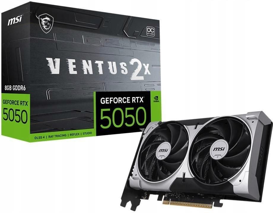 MSI GEFORCE RTX 5050 8G VENTUS 2X OC karta graficzna NVIDIA 8 GB GDDR6 MSI GEFORCE RTX 5050 8G VENTUS 2X OC. Rodzina procesorów grafiki: NVIDIA, Procesor graficzny: GeForce RTX 5050. Pamięć adaptera dedykowanej karty graficznej: 8 GB, Typ pamięci adaptera grafiki: GDDR6, Magistrala pamięci: 128 bit. Maks. rozdzielczość: 7680 x 4320 px. Wersja DirectX: 12 Ultimate, Wersja OpenGL: 4.6. Typ interfejsu: PCI Express x16 5.0. Rodzaj chłodzenia: Aktywne, Liczba wentylatorów: 2 went. Najważniejsze parametry techniczne Procesor - CUDA: Tak Procesor - Rdzenie CUDA: 2560 Procesor - Rodzina procesorów grafiki: NVIDIA Procesor - Procesor graficzny: GeForce RTX 5050 Procesor - Maksymalne taktowanie procesora: 2602 MHz Procesor - Maks. rozdzielczość: 7680 x 4320 px Procesor - Maksymalna ilość obsługiwanych wyświetlaczy: 4 Pamięć - Typ pamięci adaptera grafiki: GDDR6 Pamięć - Magistrala pamięci: 128 bit Pamięć - Szybkość przesyłania danych: 20 Gbit/s Grafika - Pamięć adaptera dedykowanej karty graficznej: 8 GB Porty We/Wy na tylnym panelu - Ilość portów HDMI: 1 Porty We/Wy na tylnym panelu - Ilość DisplayPort: 3 Porty We/Wy na tylnym panelu - Wersja DisplayPort: 2.1b Wydajność - NVIDIA G-SYNC: Tak Konstrukcja - Układ: Full-Height/Half-Length (FH/HL) Konstrukcja - Kolor produktu: Srebrny Konstrukcja - Liczba wentylatorów: 2 went. Konstrukcja - Technologia chłodzenia: MSI TORX FAN 5.0 Wydajność - Wbudowany tuner tv: Nie Wydajność - Wersja DirectX: 12 Ultimate Wydajność - Wersja OpenGL: 4.6 Wydajność - Dual Link DVI: Nie Wydajność - Edycja podkręcona (OC): Tak Cechy - Rodzaj chłodzenia: Aktywne Porty i interfejsy - Wersja HDMI: 2.1b Porty i interfejsy - Typ interfejsu: PCI Express x16 5.0 Moc - Minimalna moc zasilacza: 550 W Moc - Dodatkowe złącza zasilania: 1x 8-pin Waga i rozmiary - Głębokość produktu: 41 mm Waga i rozmiary - Waga produktu: 197 g Waga i rozmiary - Długość produktu: 491 mm Waga i rozmiary - Wysokość produktu: 120 mm Waga i rozmiary - Waga wraz z opakowaniem: 827 g Zawartość opakowania - Rodzaj opakowania: Pudełko Zawartość opakowania - Przewody: Zasilanie Klasyfikacja - Kod producenta: GeForce RTX 5050 8G VENTUS 2X OC Klasyfikacja - EAN: 4711377380003 Klasyfikacja - ID Produktu: 132898705