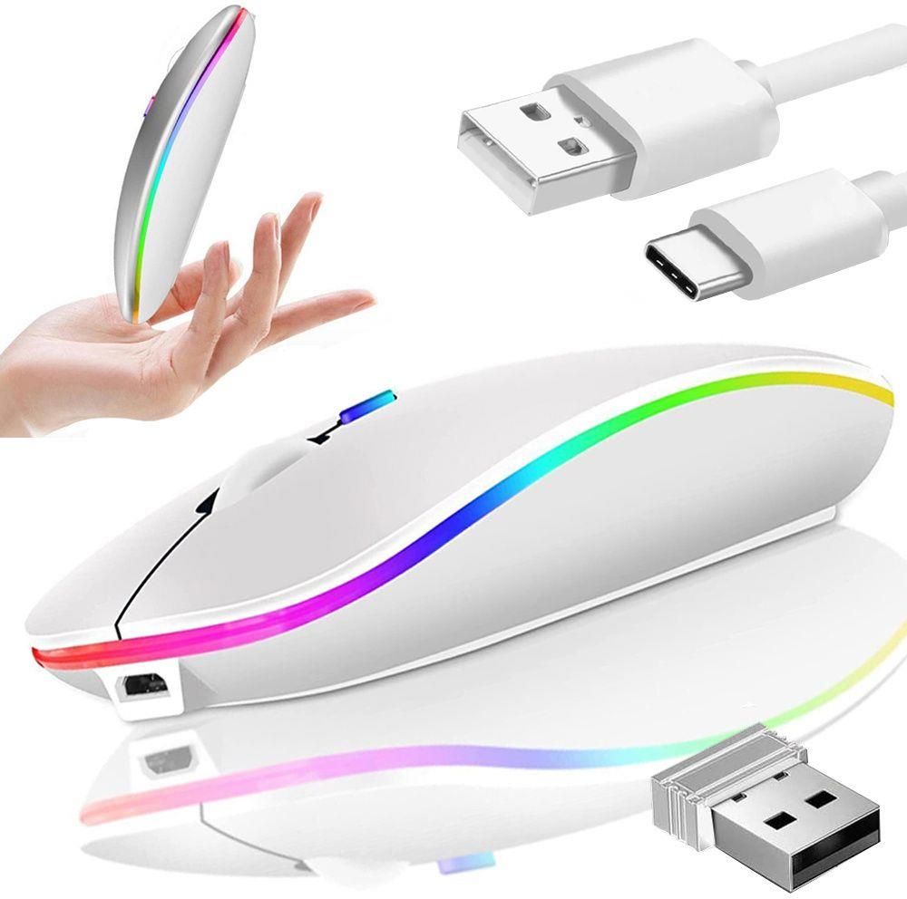 Bezprzewodowa myszka optyczna z podświetleniem LED RGB Nowoczesny wygląd myszy oraz wysoka ergonomia zapewniają wysoki komfort użytkowania. Zasilana za pomocą wbudowanego akumulatora (ładowanie dołączonym w zestawie kablem). Nie wymaga żadnych dodatkowych sterowników (działa od razu po podłączeniu nadajnika do portu USB bądź poprzez Bluetooth). Mysz posiada możliwość zmiany rozdzielczości DPI za pomocą dedykowanego przycisku. Cechy produktu Bezprzewodowa myszka optyczna z estetycznym podświetleniem LED RGB. Przeznaczona do komputerów stacjonarnych i notebooków. Ergonomiczny kształt i niewielka waga sprawia, że myszką wygodnie się steruje. Doskonale leży w dłoni, nie powoduje zmęczenia w czasie pracy. Działa natychmiast po podłączeniu nadajnika do portu USB bądź poprzez interfejs Bluetooth. Nie wymaga instalacji jakichkolwiek sterowników (Plug & Play). Możliwość zmiany rozdzielczości DPI za pomocą dedykowanego przycisku. Specyfikacja Materiał: plastik PP Zasilanie: wbudowany akumulator Interfejs: USB (Radio 2,4 GHz) / Bluetooth Podświetlenie LED RGB Rozdzielczość: 1600, 1200, 1000 DPI (zmiana za pomocą dedykowanego przycisku) Ilość przycisków: 4 + scroll Technologia Plug & Play (nie wymaga sterowników) Kompatybilna z Windows 7 wzwyż Wymiary: 11 cm x 6 cm x 2,5 cm Kolor: biały Opakowanie: kartonowe pudełko Instrukcja obsługi w formacie PDF do pobrania w sekcji Dodatkowe informacje