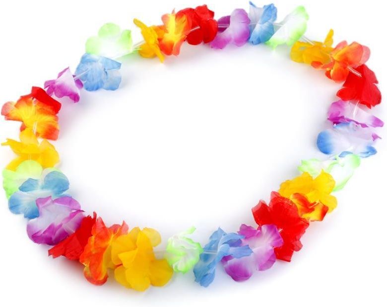 Wieniec hawajski, którego nie może zabraknąć na imprezie hawajskiej czy w karnawale. Składa się z kwiatków tekstynych i plastikowych rurek, które są nawleczone na sznurku. Kwiaty na wieńcu lśnią wesołymi kolorami. Obwód: 105 cm Wykonany poliester plastik