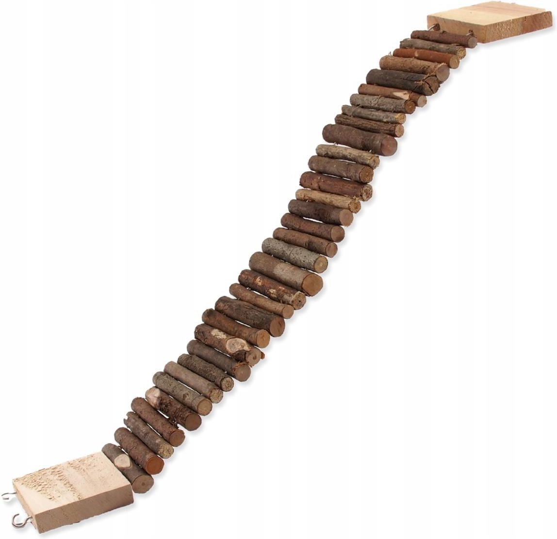 Charakterystyka wyginanego drewnianego pomostu dla gryzoni Pomost jest wykonany z połączonych metalowym drutem kilkudziesięciu nieokorowanych patyczków owocowego drzewa Dzięki temu całość można dowolnie wygiąć. W ten sposób można uformować mostek albo pomost o pożądanym kształcie i przymocować dzięki haczykom przykręconym na obu końcach. Akcesorium doskonale sprawdzi się jako element wyposażenia klatki dla gryzoni. Produkt w swoim składzie zawiera jedynie drewno, dlatego nie jest toksyczny. Zapewne będzie chętnie podgryzany, co pomoże zwierzakowi w ścieraniu stale rosnących u gryzoni zębów. Wymiary mostku szerokość: 7cm długość: 55cm Uwaga! Jeśli zabawka zostanie przez zwierzę uszkodzona, należy wyjąć ją z klatki, aby uniknąć połknięcia małych kawałków. Produkt wyłącznie dla zwierząt domowych, nie należy go używać do innych celów. Zabawka nie jest przeznaczona dla dzieci. Należy trzymać ją z dala od ognia.