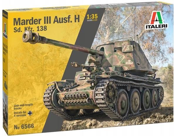 Model plastikowy do sklejania w skali 1:35, niemieckiego niszczyciela czołgów Marder III Sd.Kfz.138 Ausf.H z okresu II wojny światowej. Zawartość: - model do sklejania Marder III Sd.Kfz.138 Ausf.H, - 2 figurki, - plastikowe gąsienice podzielone na ogniwka i gotowe sekcje, - kalkomania. Historia: Niemiecki niszczyciel czołgów Sd.Kfz.138 Marder III został opracowany na potrzeby armii niemieckiej w oparciu o podwozie przestarzałego, ale dostępnego, czechosłowackiego czołgu lekkiego Panzer 38 (t). Modyfikacja polegała na zastosowaniu w otwartej konstrukcji chronionej pochyloną płytą, skutecznego działa przeciwpancernego PaK 40 kal. 75 mm. Marder III Ausf.H miał silnik zamontowany z tyłu pojazdu i system uzbrojenia w centralnym położeniu, aby zapewnić większą ochronę załodze. W tej konfiguracji Wehrmacht dysponował niszczycielem czołgów, który był łatwy do wyprodukowania i posiadał siłę ognia, która mogła przeciwdziałać głównym czołgom bojowym tamtego okresu. Wszedł do produkcji w 1942 roku, aby sprostać wyzwaniom teatru operacyjnego frontu wschodniego, ale ostatecznie został rozmieszczony na wszystkich frontach aż do końca wojny. Wymiary: model: długość 133mm, opakowanie: 34,5 x 24,5 x 5cm. Dane techniczne: Numer katalogowy: 6566, Producent: Italeri, Skala: 1:35, Okres: II wojna światowa, Państwo: Niemcy.