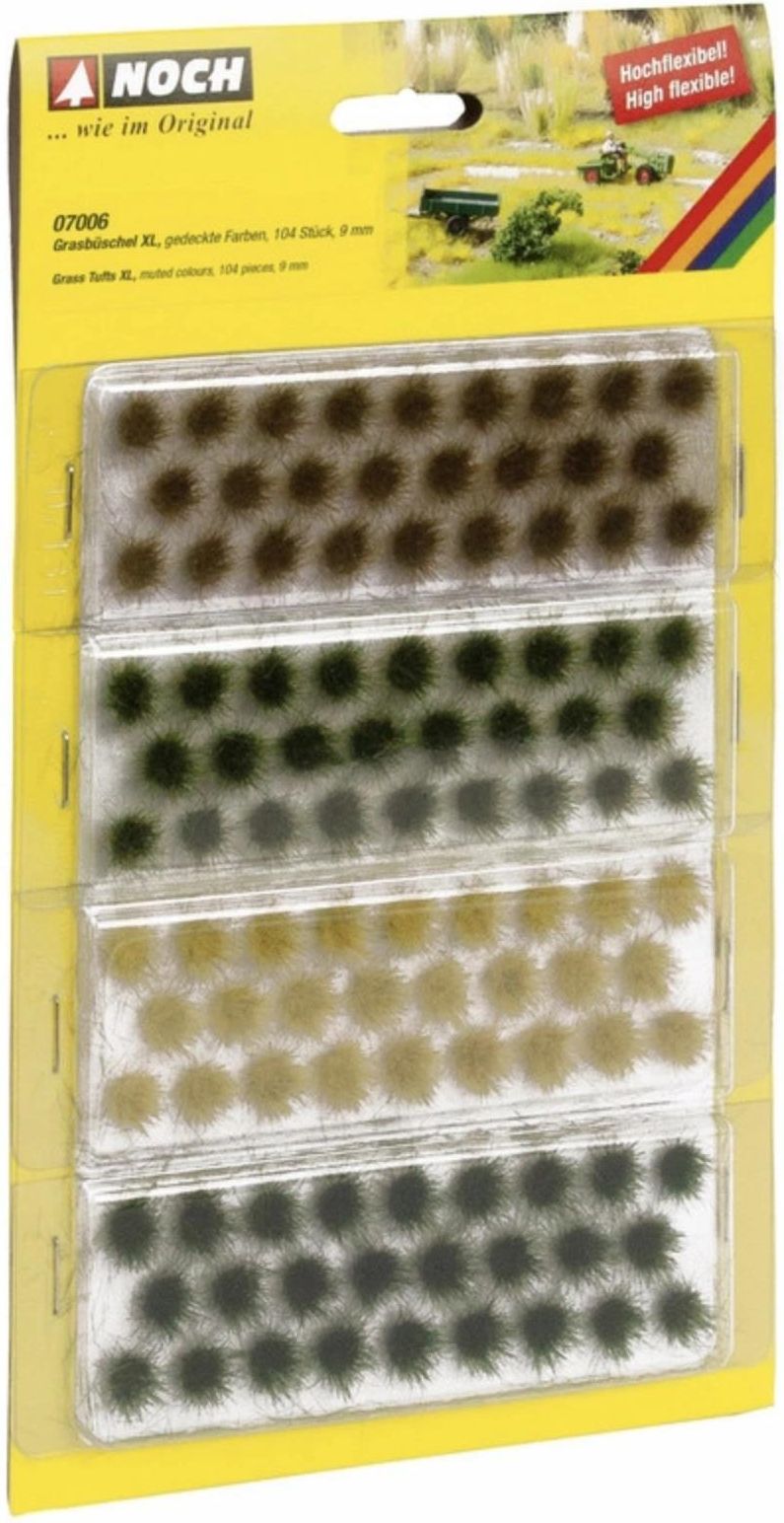 NOCH 07006 Kępki traw XL 9mm - MIX 104pcs [dark green, medium green, brown, golden yellow] Dzięki NOCH kępkom trawy XL możesz realistycznie ozdobić łąki, nabrzeża, brzegi lasu i wiele innych scenerii na modelowym krajobrazie. W ten sposób można w krótkim czasie stworzyć naturalnie wyglądającą roślinność. Nawet w bardzo długiej wersji dzięki kępkom XL! Kępki trawy są bardzo elastyczne i szczególnie łatwe w użyciu, ponieważ można je po prostu wstawić w krajobraz. W ten sposób z prostej łąki można stworzyć urozmaicony krajobraz.